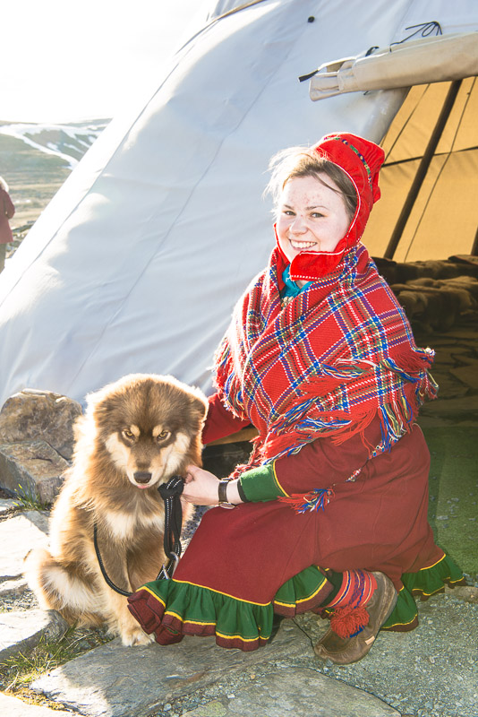 Traditionelle Tracht bei der Tochter, Rentierfellmantel beim Vater.