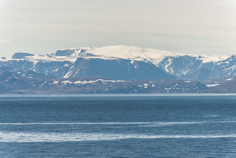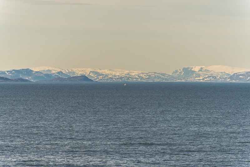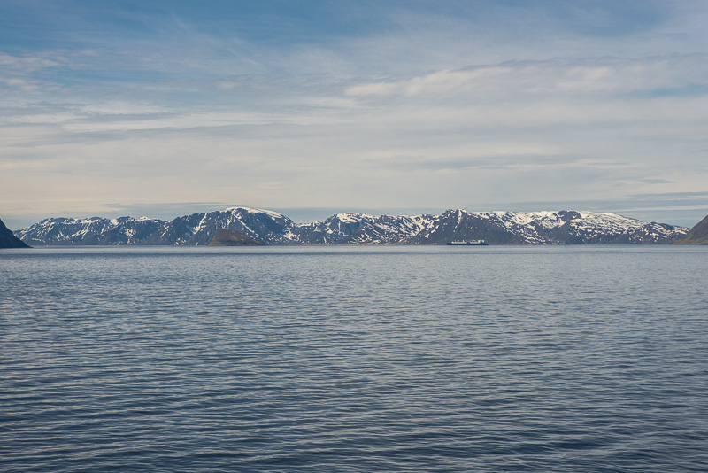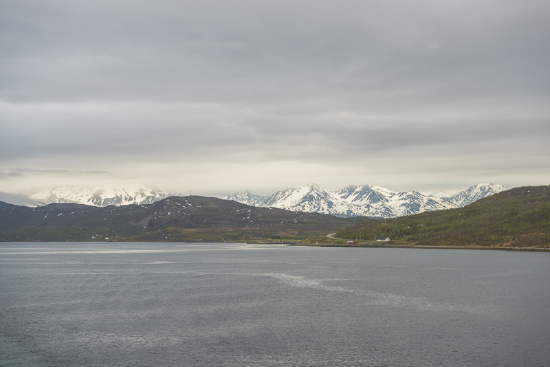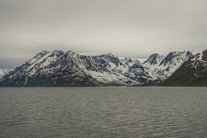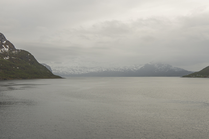 Nur mehr eine knappe Stunde bis Hammerfest. Berge wieder bis über 600 m Seehöhe, im Mai so weit im Norden natürlich noch schneebedeckt.