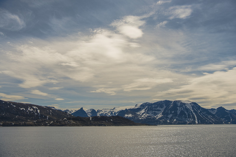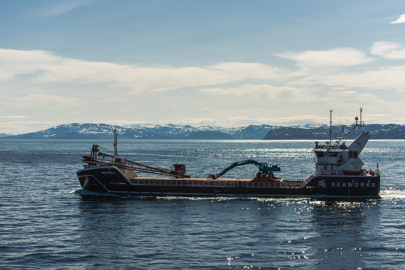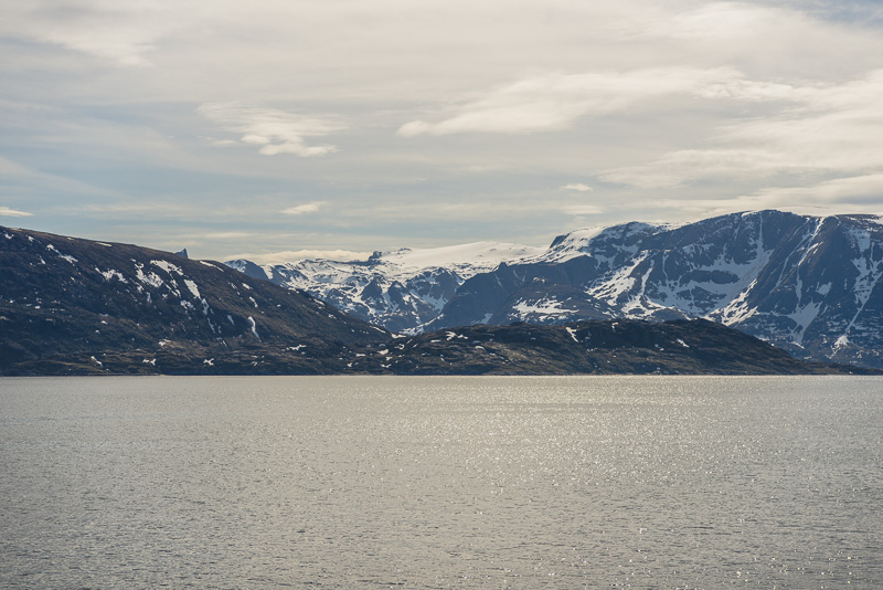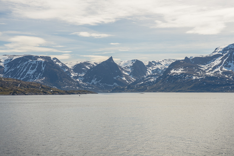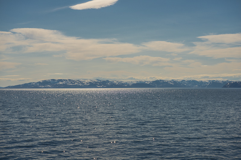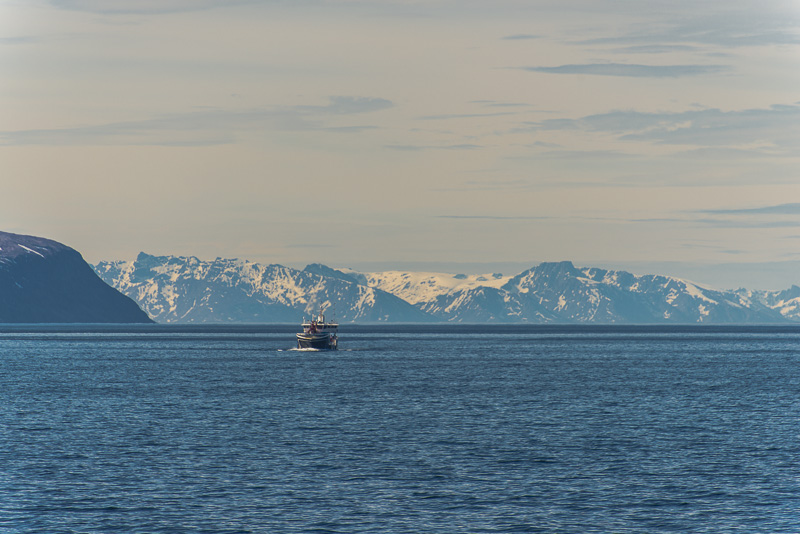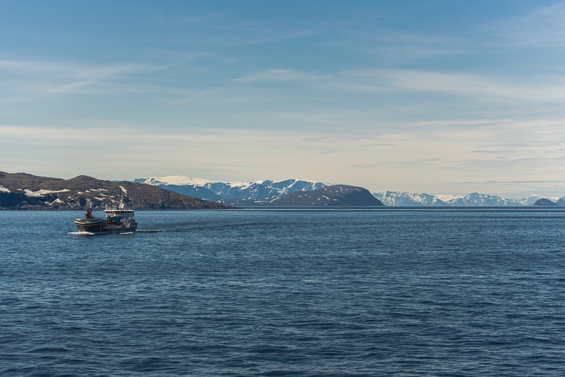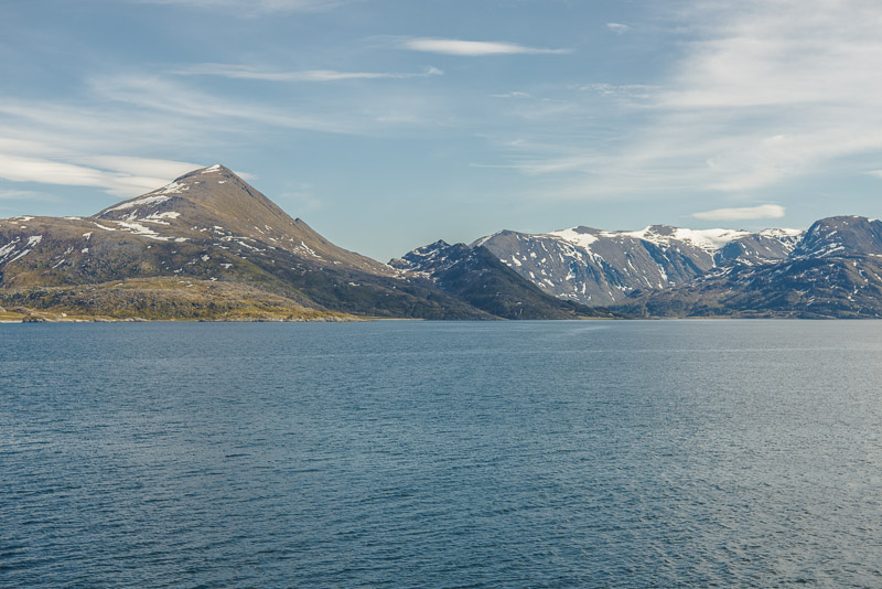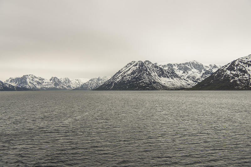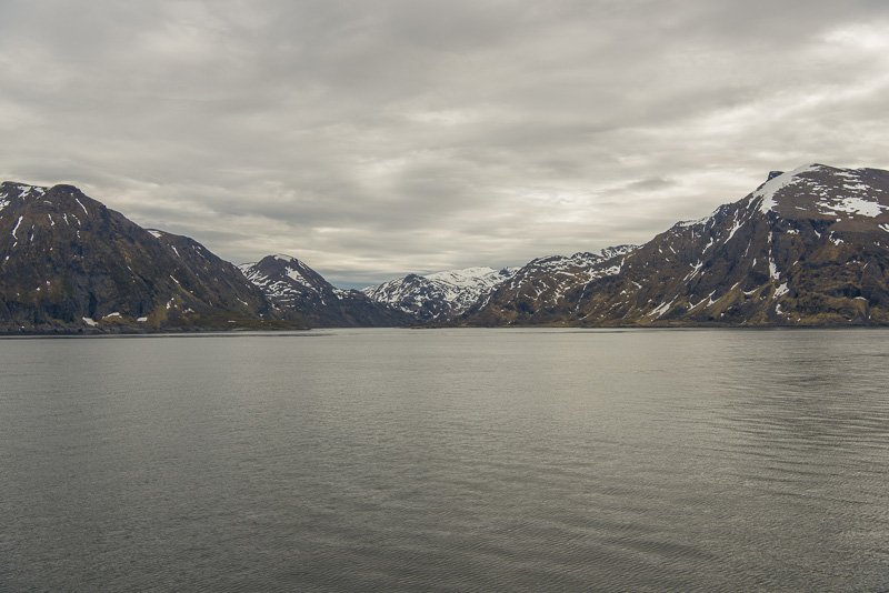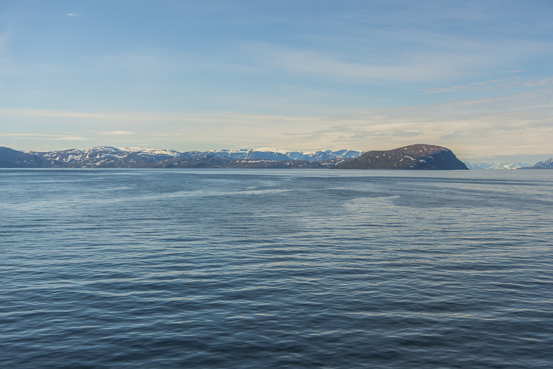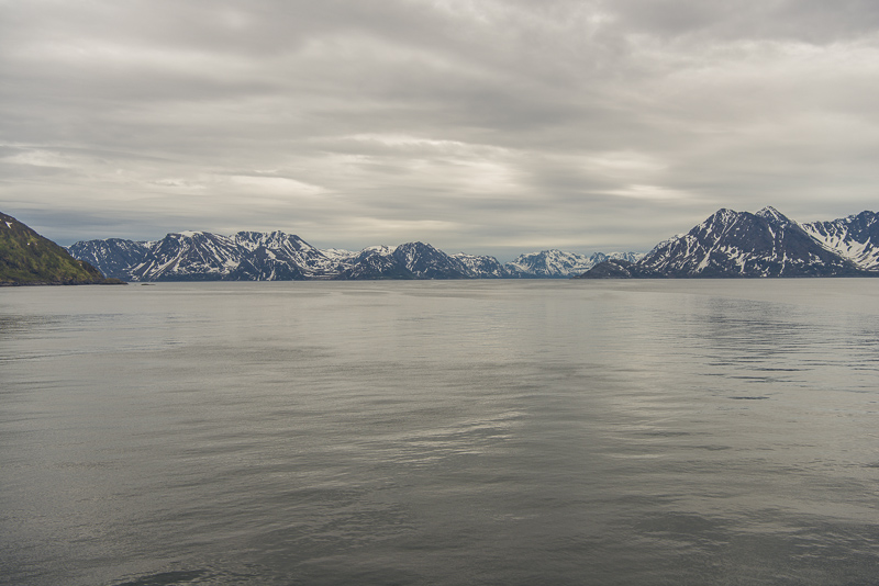 Es geht jetzt durch den Sørøysund nach Südwesten. Links die Berge der Insel Seiland, bis über 1.000 m hoch und teilweise vergletschert.