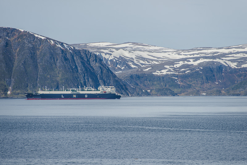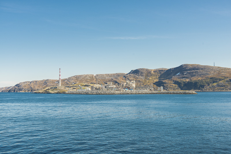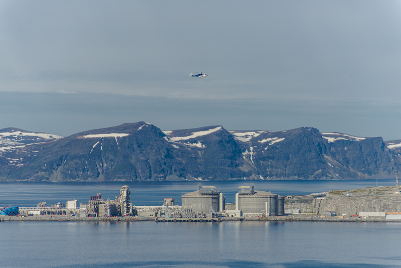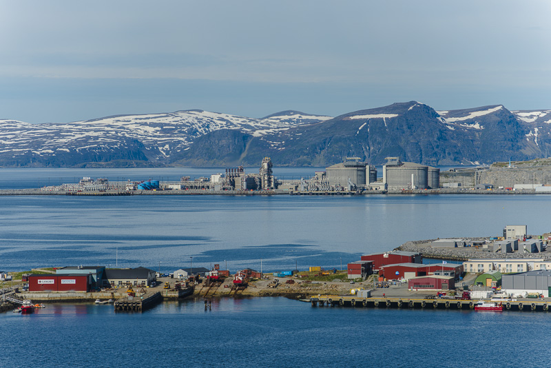 Wir biegen jetzt um die Ecke, Richtung Süden, und nähern uns Hammerfest. Hier hat man auf der kleinen Insel Melkøya eine riesige Raffinierie erbaut, die das Erdgas, das man vom Snøhvit - ("Schneewittchen-") Erdgasfeld in der Barentsee 140 km weit im Norwesten von hier am Kontinentalschelf des Nordatlantiks gefunden hat, zu verflüssigen. Per Tankschiff erfolgt dann der Weitertransport des flüssigen Gases direkt von hier.