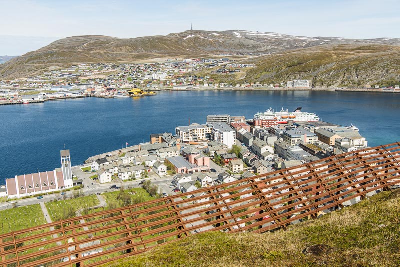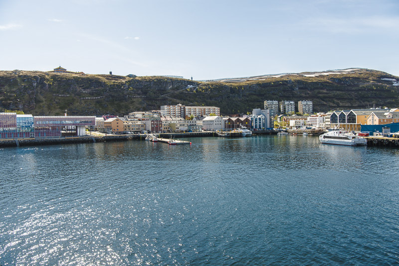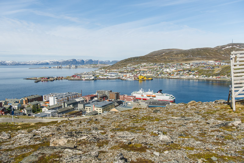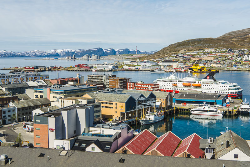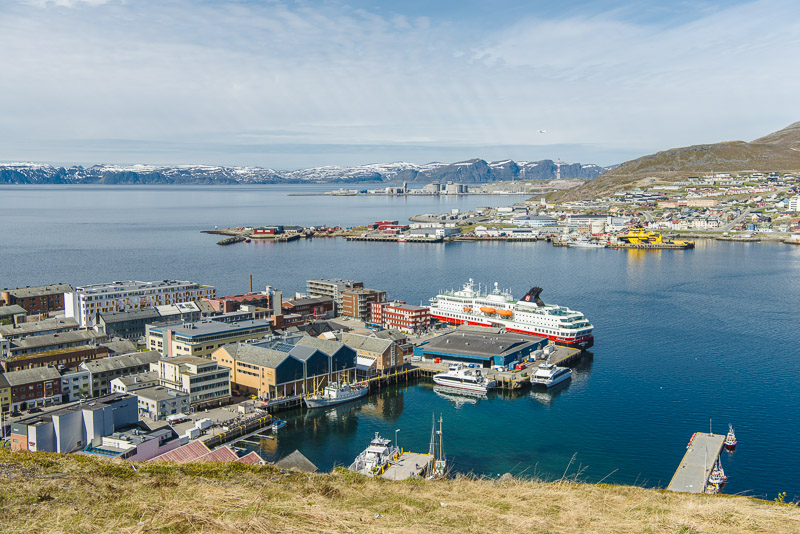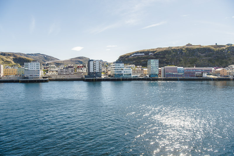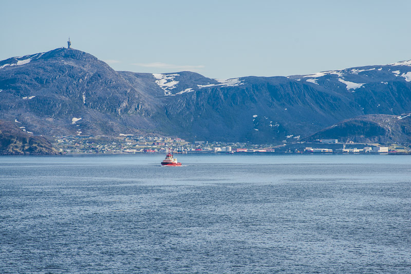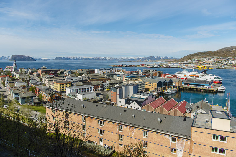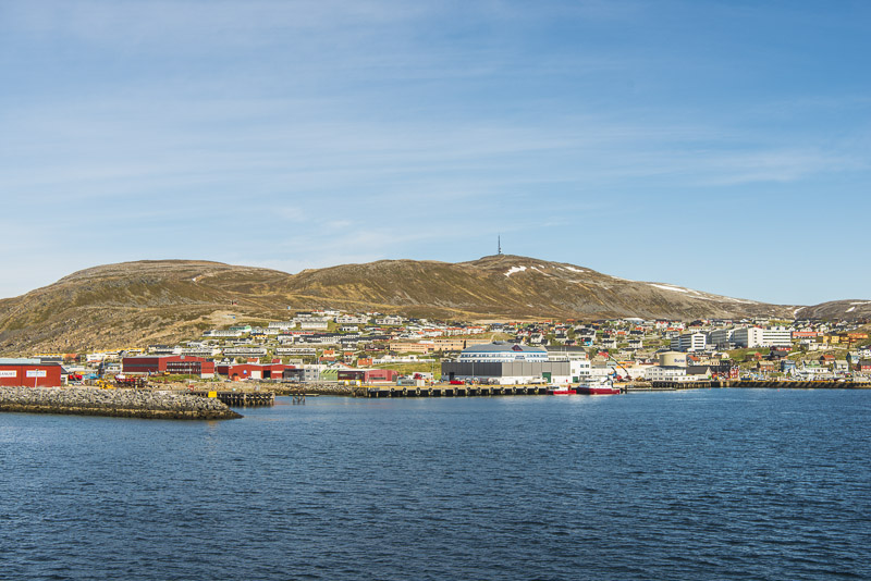 Erster Blick auf Hammerfest, das viele Jahre als nördlichste Stadt der Welt gegolten hat. Mittlerweile hat das wesentlich nördlicher gelegene Honningsvåg auch das Stadtrecht erhalten, und Longyearbyen auf Spitzbergen hat auch schon 2.000 Einwohner.