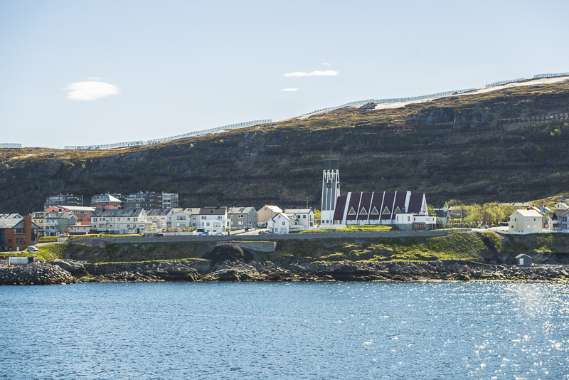 Hammerfest mit seiner modernen Kirche. Auch diese Stadt wurde am Ende des 2. Weltkriegs vollständig zerstört.