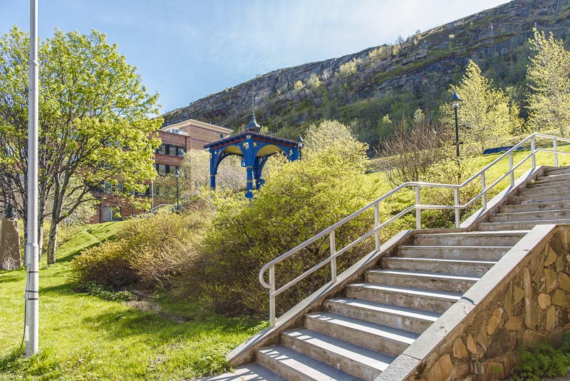 Los geht´s - durch den kleinen Park, an dem blauen Pavillon vorbei ...