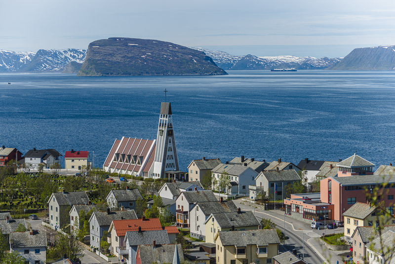 Blick über die Kirche von Hammerfest und die Bucht zur Insel Sørøya. Der dachartige Felsen links ist die kleine unbewohnte Insel Håja.