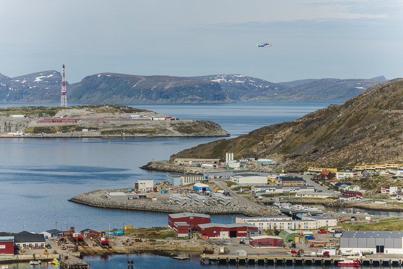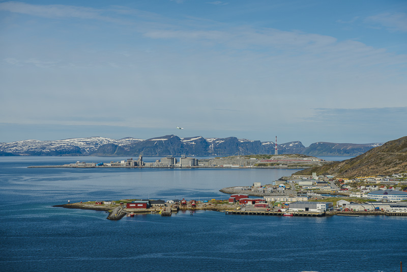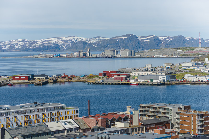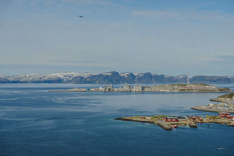 Blick über Hammerfest und zur Erdgasraffinierie auf Melkøya. Dahinter die größere Insel Sørøya.