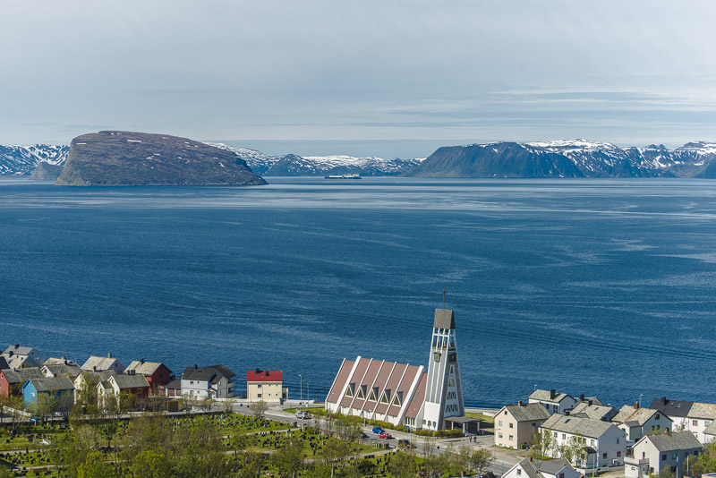 Jetzt bin ich oberhalb der Kirche, davor der Friedhof. Im Hintergrund die Erdgasraffinierie auf Melkøya. Dahinter die größere Insel Sørøya.