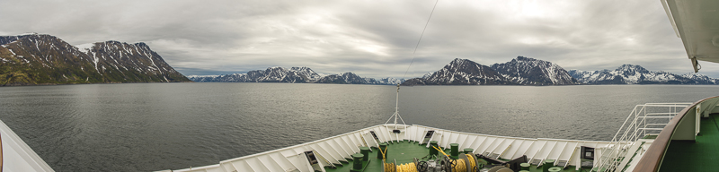 Ein "schnelles" Panorama vom Vorderdeck der Nordnorge, kurz vor Einfahrt in den Øksfjord. Hierher oder ins Bild klicken für eine größere Darstellung.