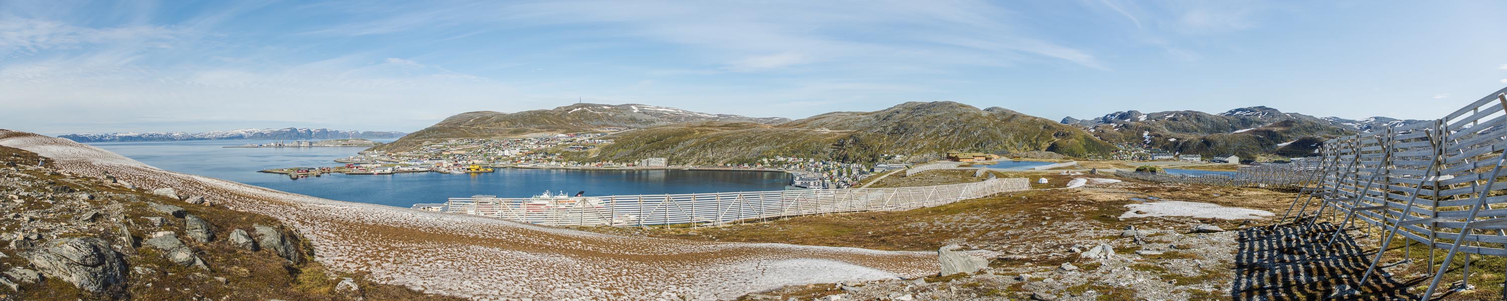 Panoramic picture from the hill behind Hammerfest, with the Salsvannet and the view over the cove to the refinery and the airport.