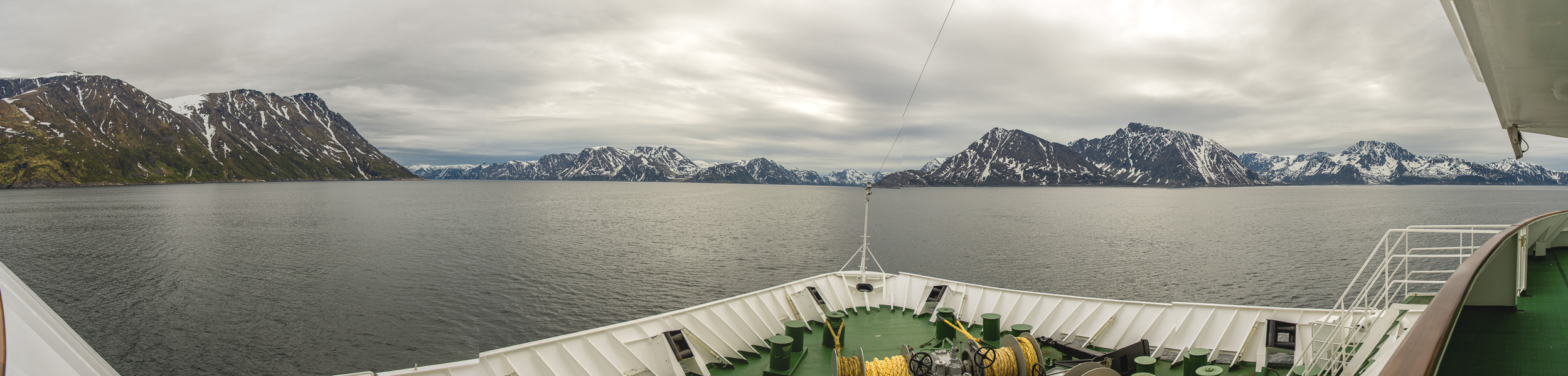 A "fast" panorama from the foredeck of the Nordnorge, shortly before entering the Øksfjord.