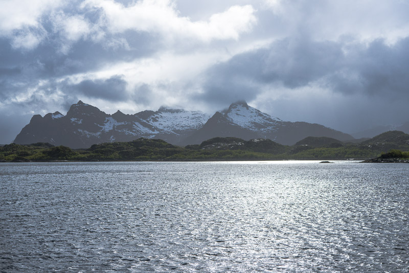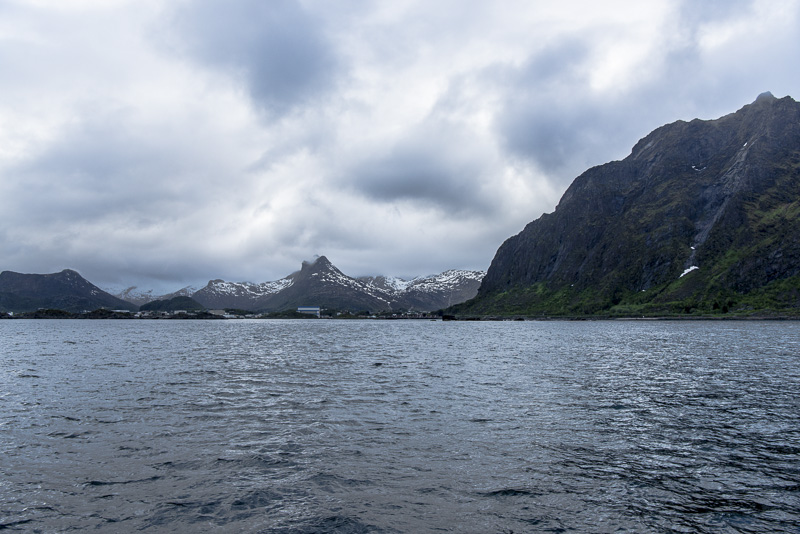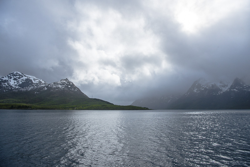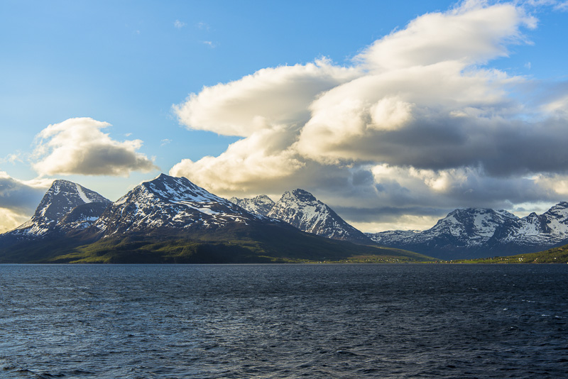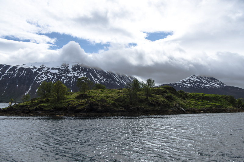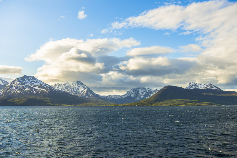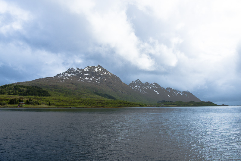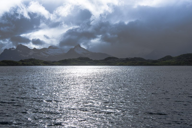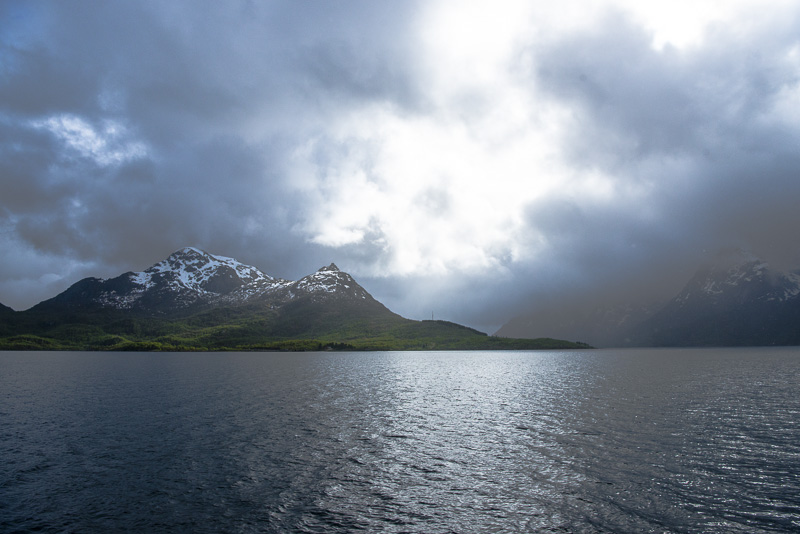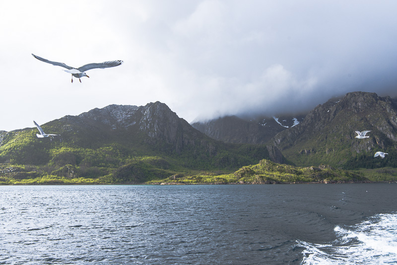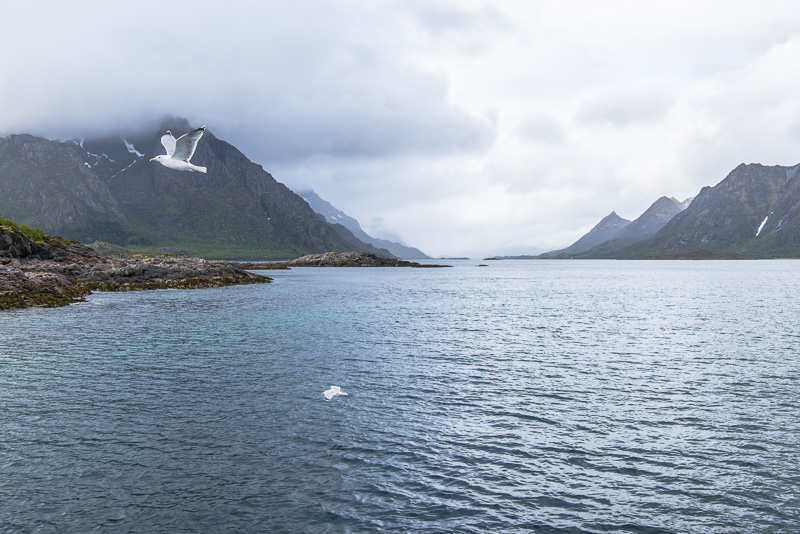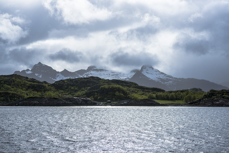 Der Raftsund ist beidseits von steilen Berghängen gesäumt, die bis auf über 1.000 m ansteigen.