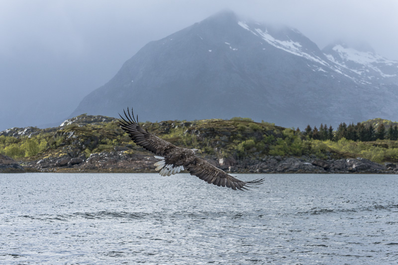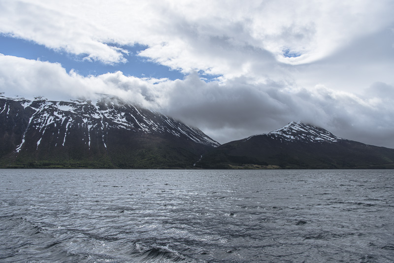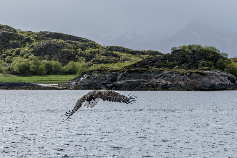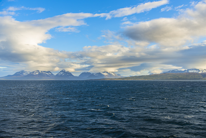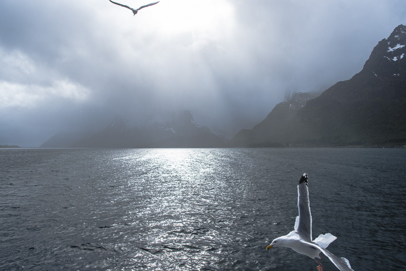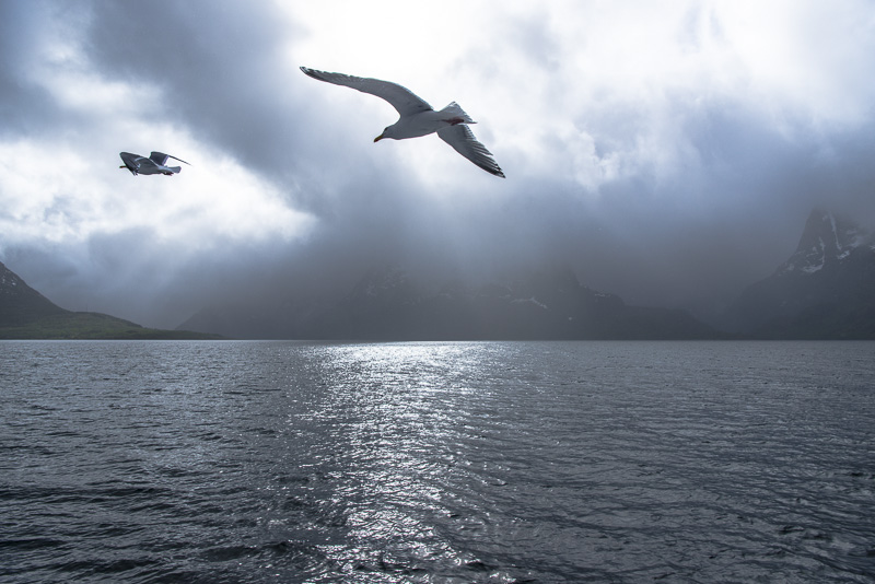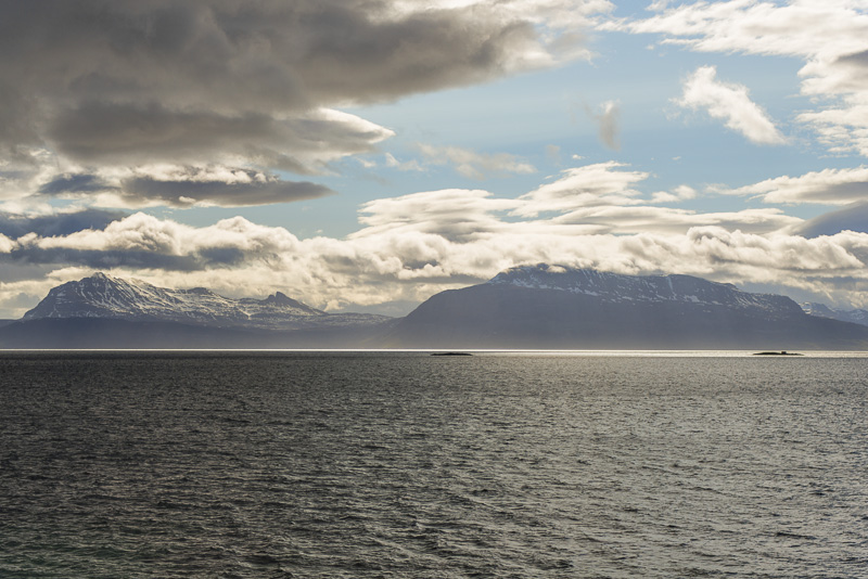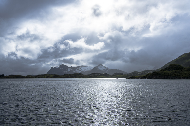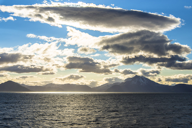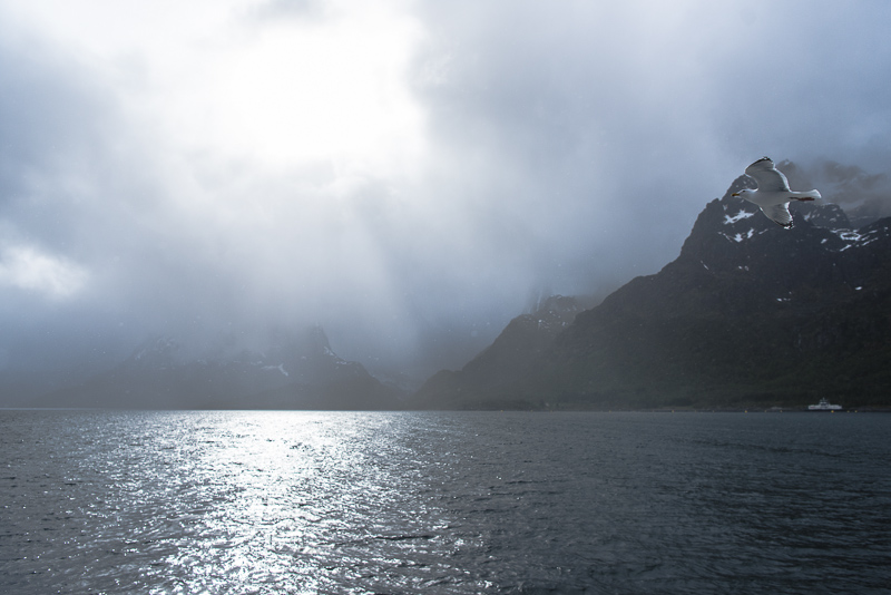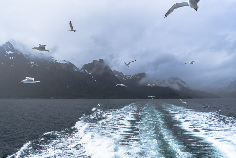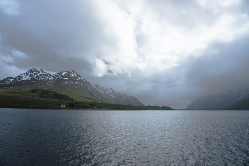 Der Raftsund ist beidseits von steilen Berghängen gesäumt, die bis auf über 1.000 m ansteigen.