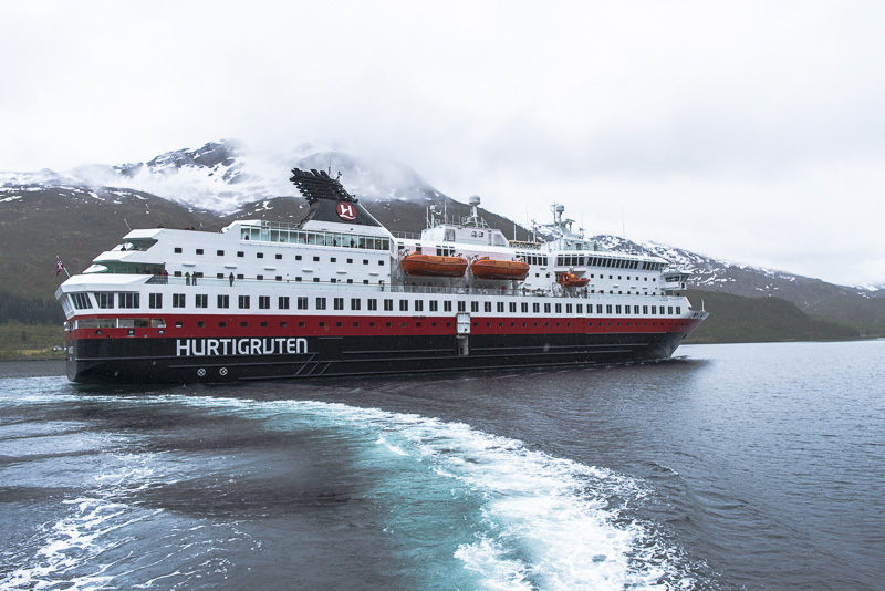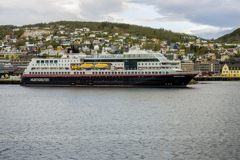 Das Hurtigruten - Schiff "MS Midnatsol" liegt schon abfahrbereit im Hafen von Harstad.