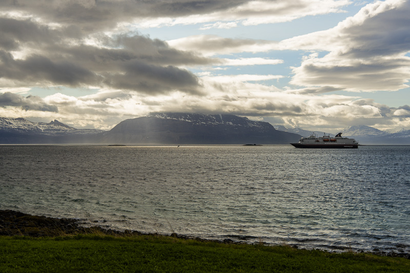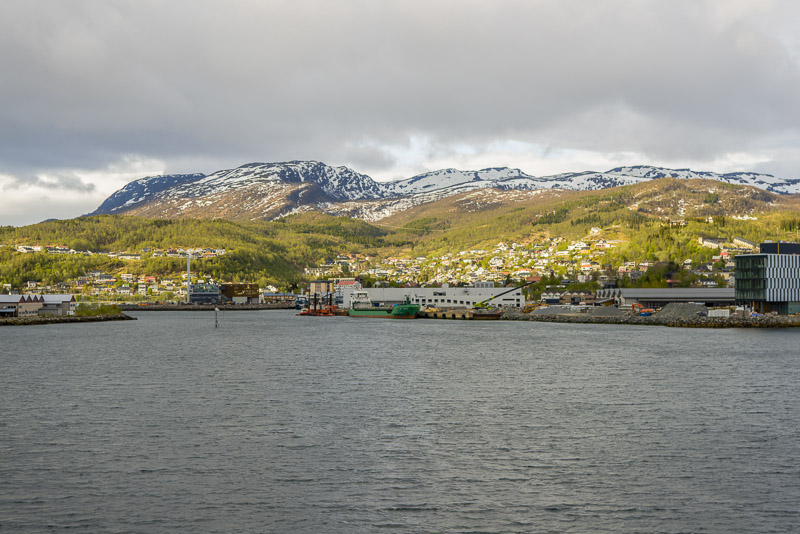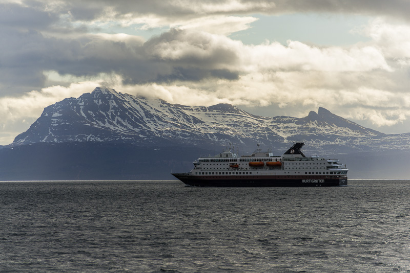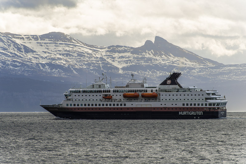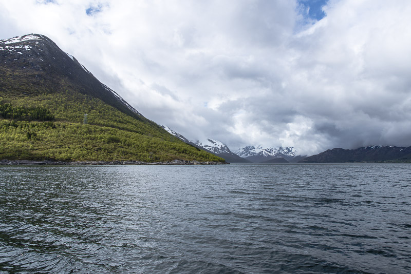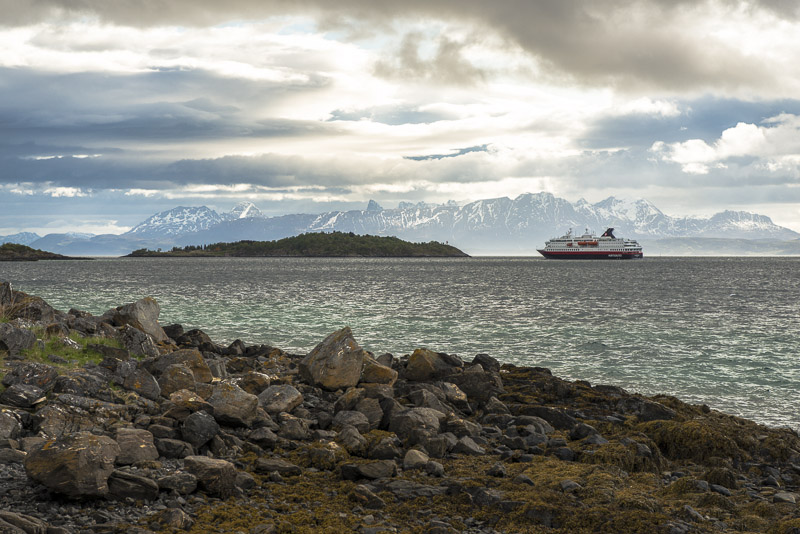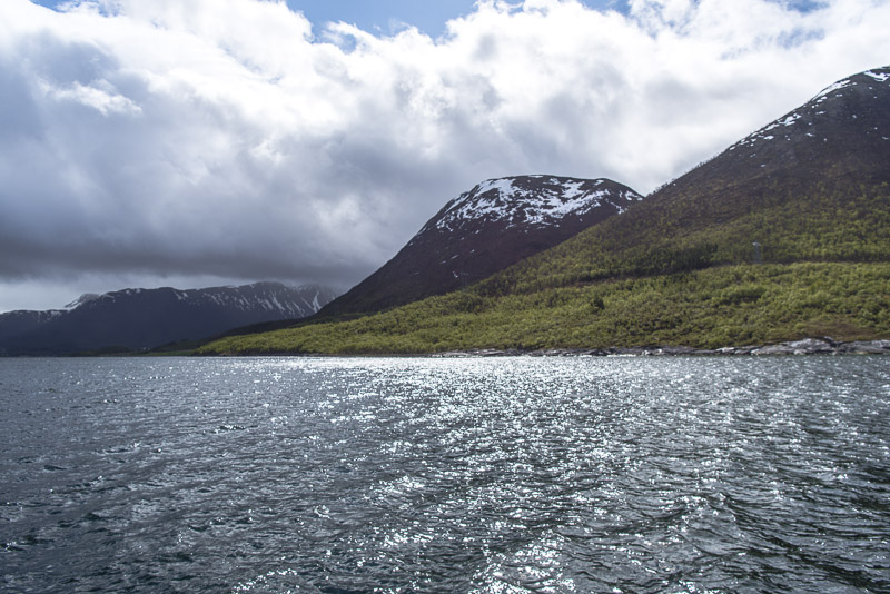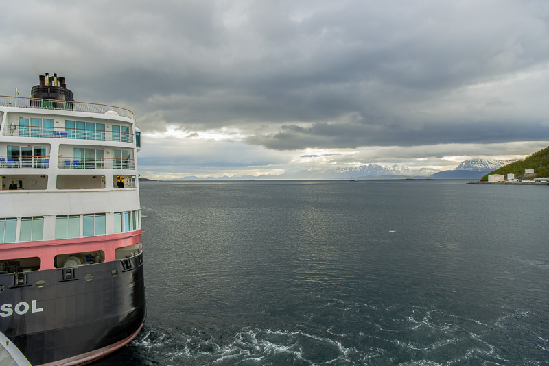 Wir fahren weiter den Gullesfjord entlang, biegen dann ein entlang des Langvatnet - Sees, um schließlich am Sigerfjord entlang und nach Norden zur Brücke über den Sortlandsund zu kommen. Unterwegs sind Bilder praktisch unmöglich. Jedoch könne wir von der Brücke aus unser Schiff kommen sehen - eine Maßarbeit bezüglich des Zeitplans!