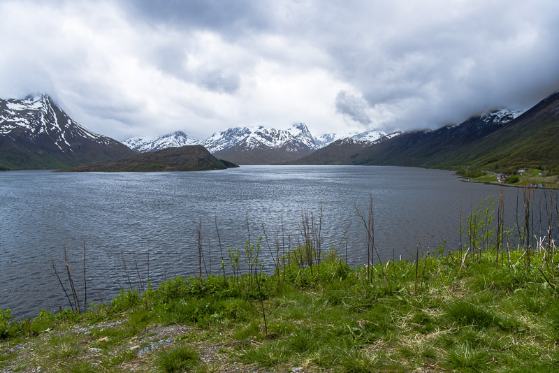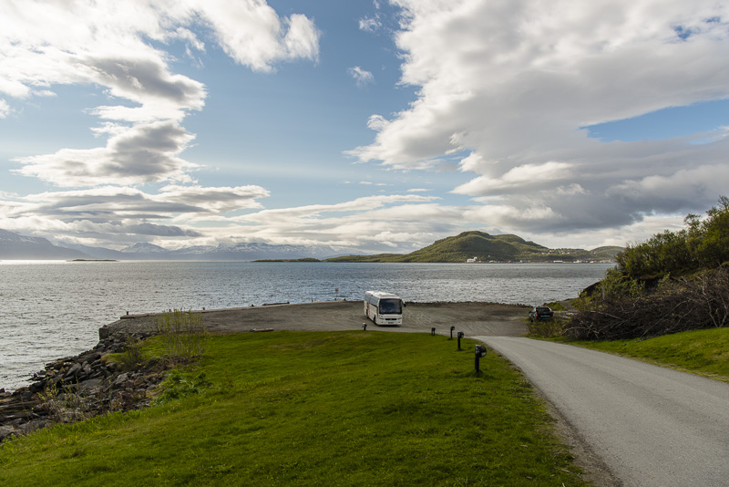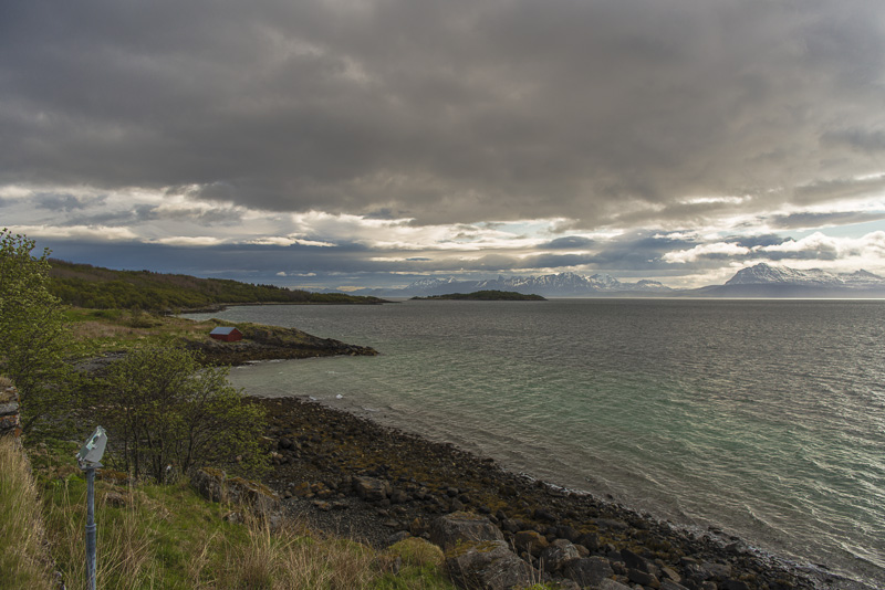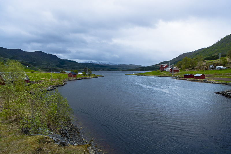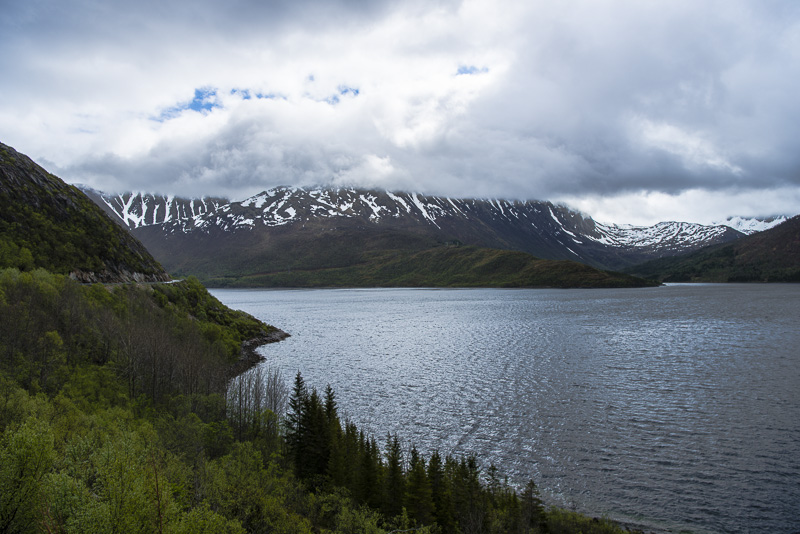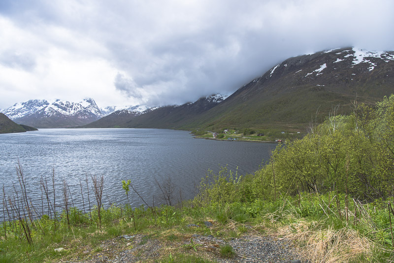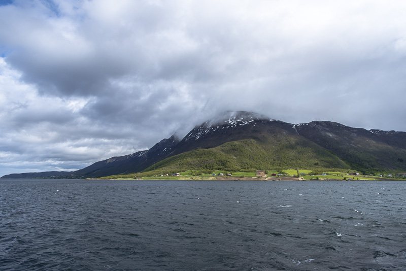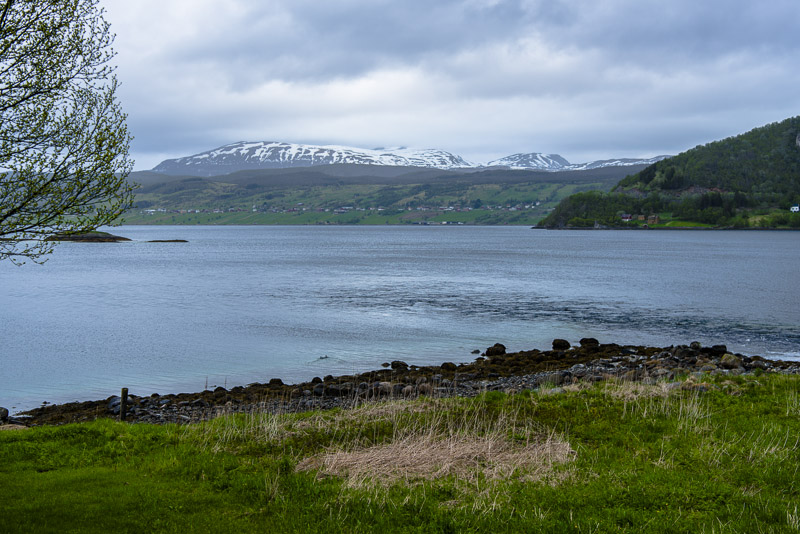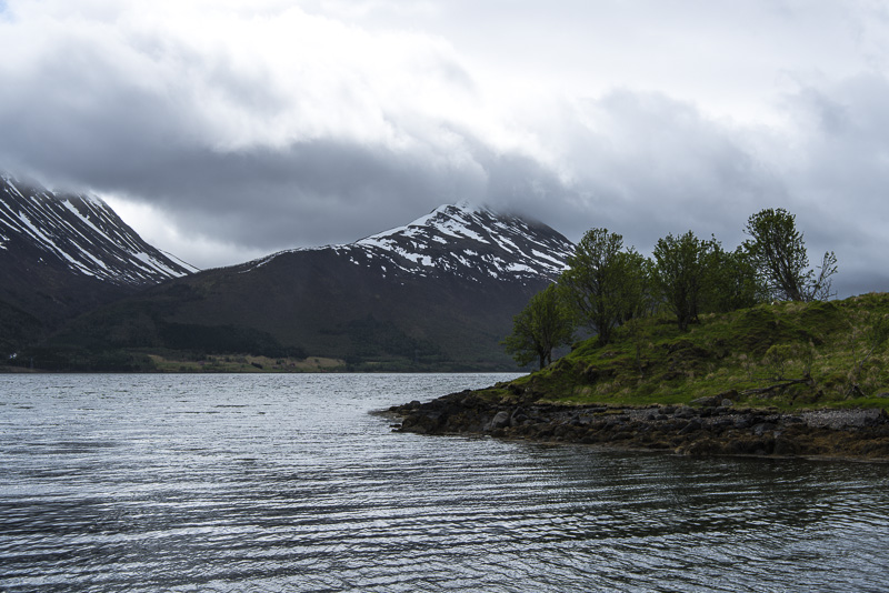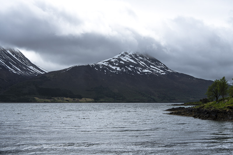 Wir biegen nach Süden ein und fahren den Gullesfjord entlang. Der Tverrelvtindan (1.118 m) im Hintergrund ist heute leider in Wolken gehüllt.
