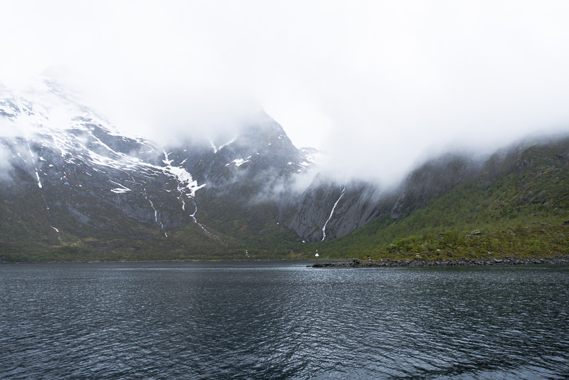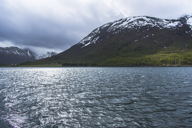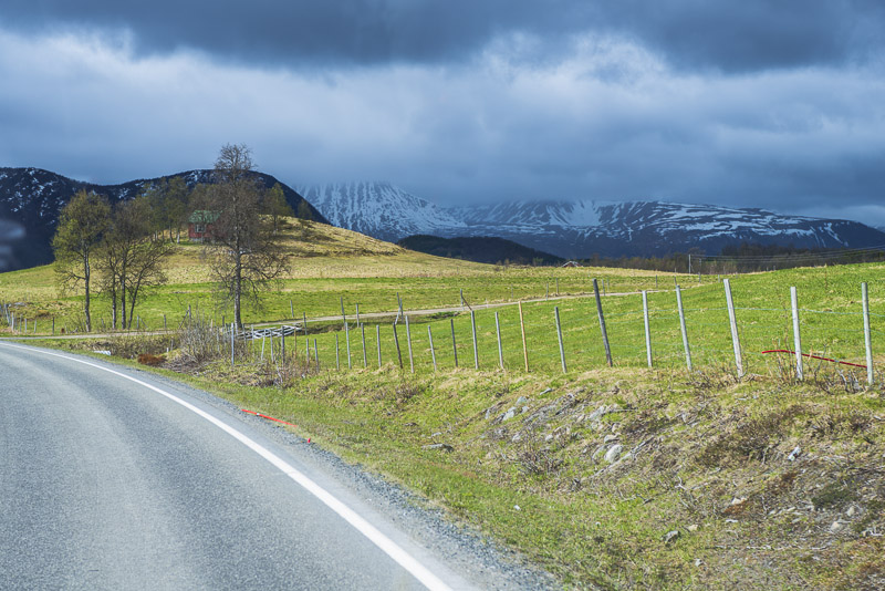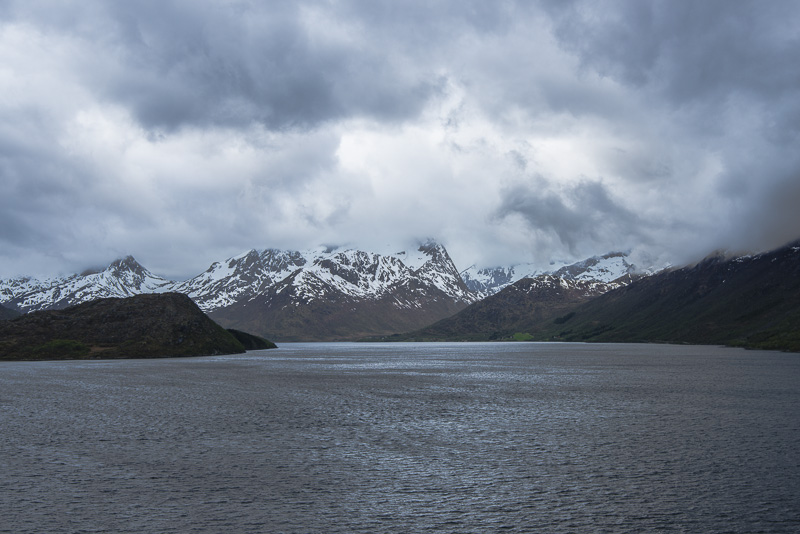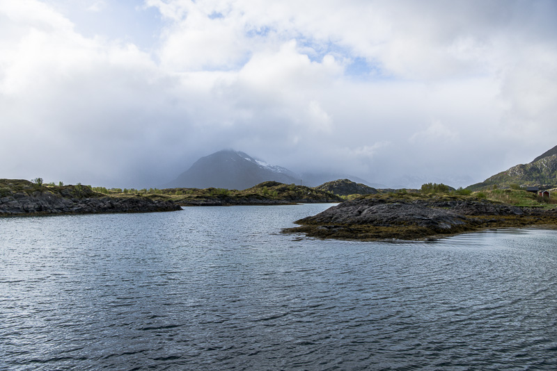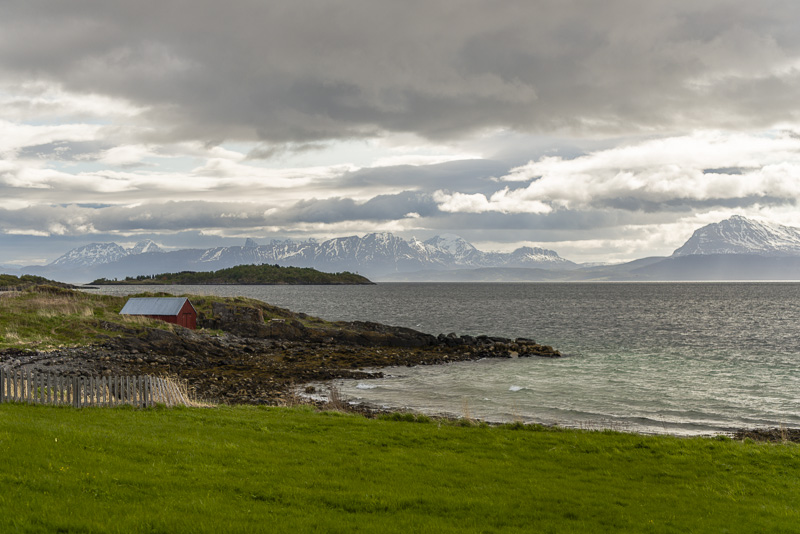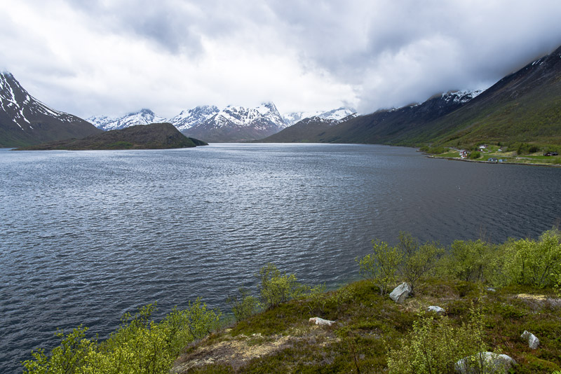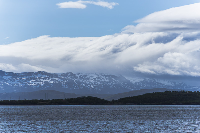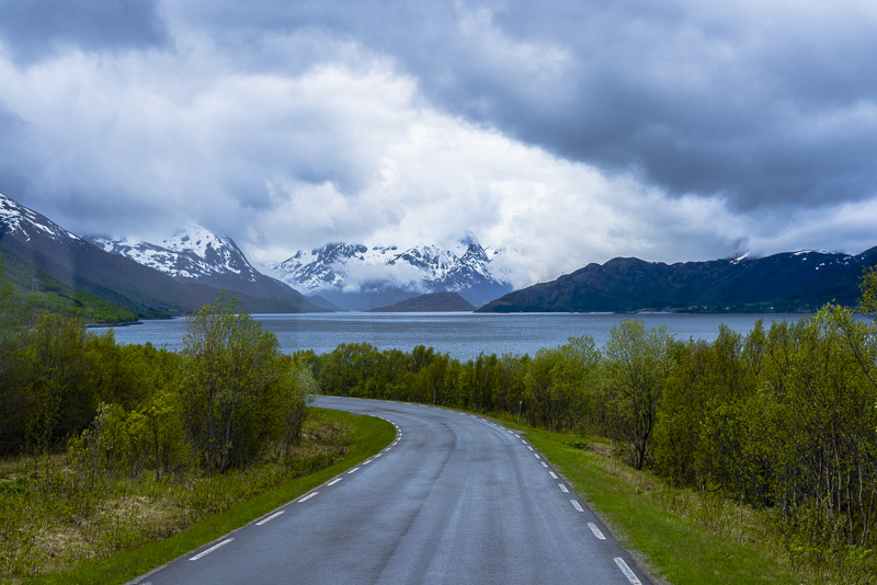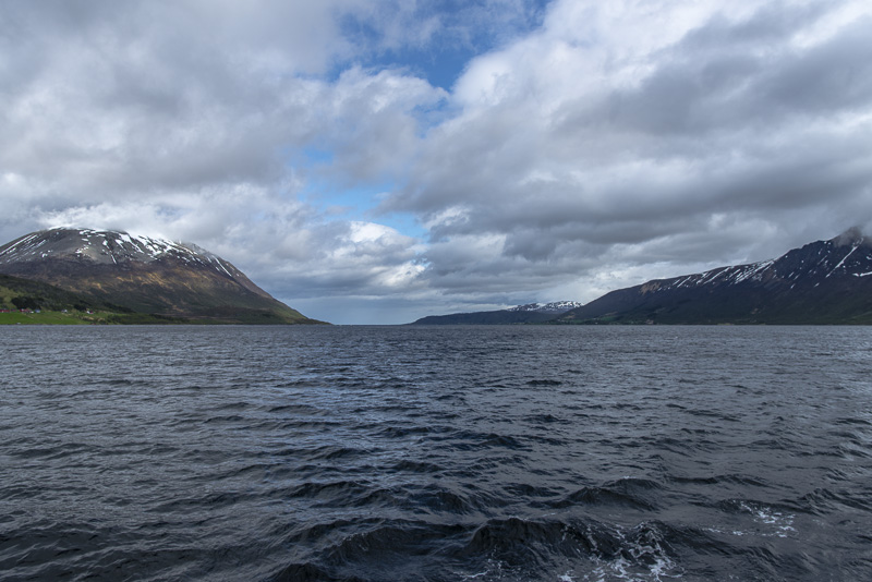Wir biegen nach Süden ein und fahren den Gullesfjord entlang. Der Tverrelvtindan (1.118 m) im Hintergrund ist heute leider in Wolken gehüllt.