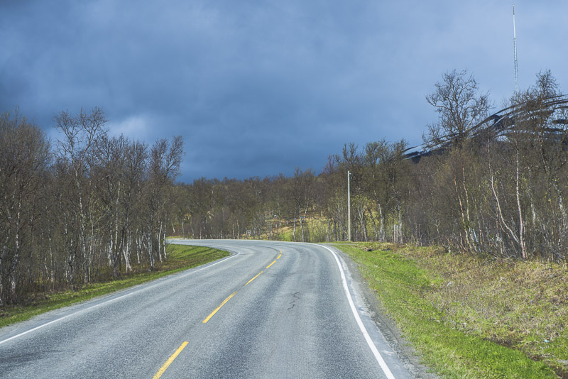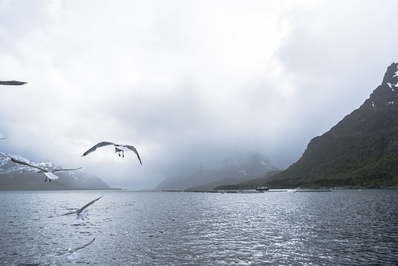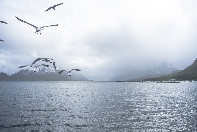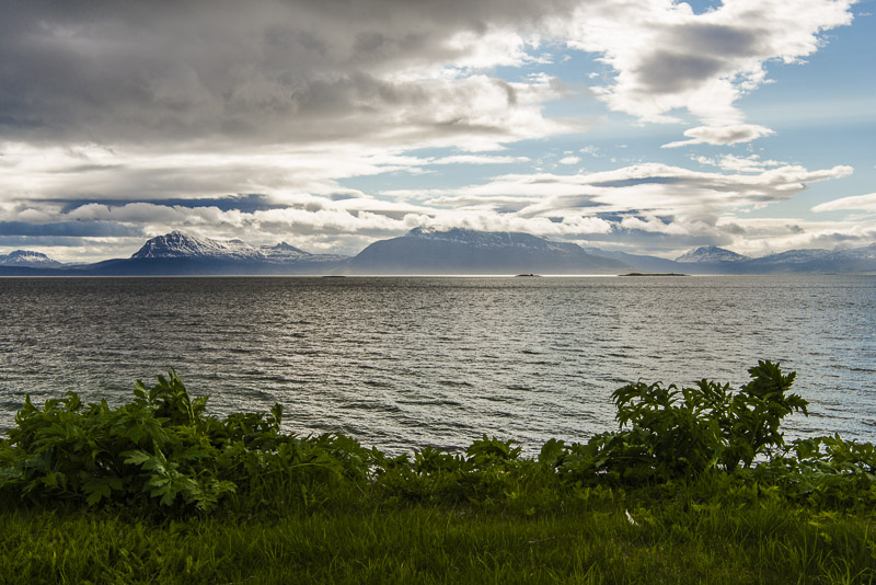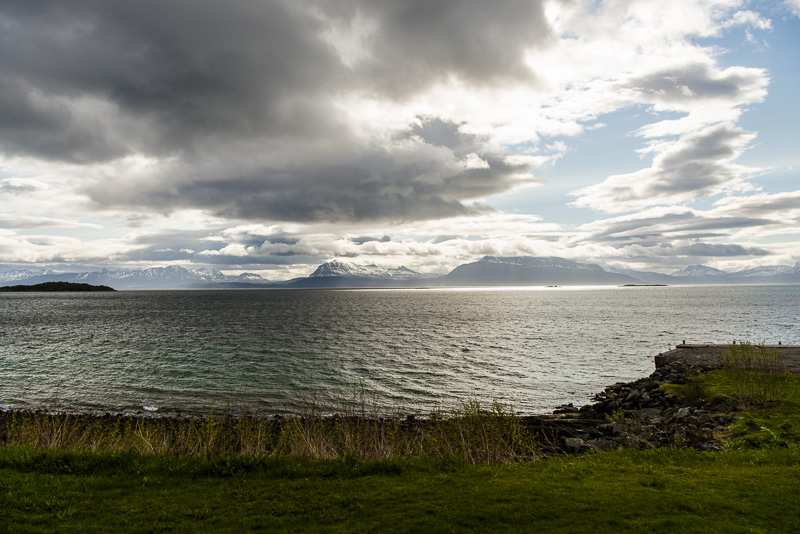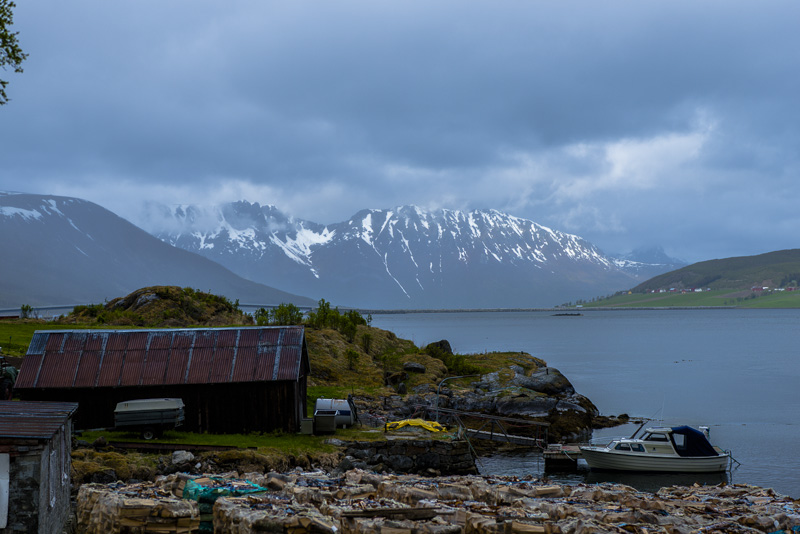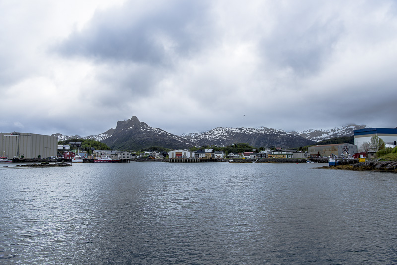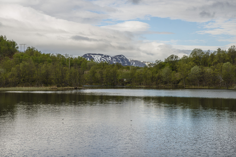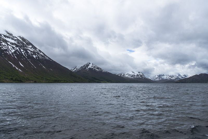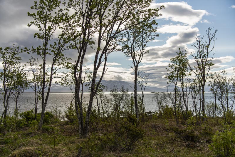 Wir biegen nach Süden ein und fahren den Gullesfjord entlang. Der Tverrelvtindan (1.118 m) im Hintergrund ist heute leider in Wolken gehüllt.