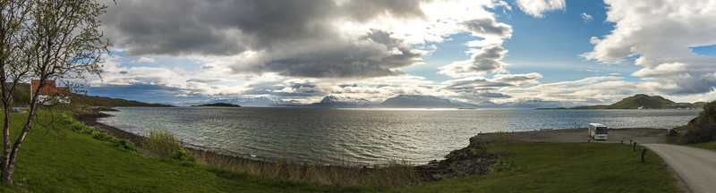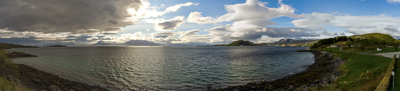 180 Grad Panoramabild des Vågsfjorden, ganz links die Trondeneskirche. Rechts der Parkplatz beim Vikingermuseum. Hierher oder ins Bild klicken für eine größere Darstellung.