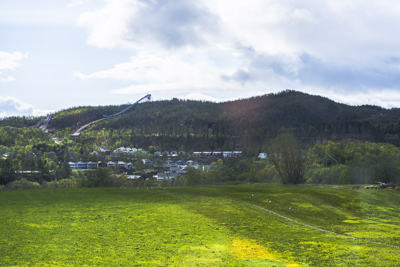 Øysund, in der Mitte die Insel Kvæøya. Sie hat 800 Einwohner, und man hat eine Brücke hinüber gebaut. Der grüne Streifen an der Küste entlang ist ehemaliger Meeresboden (nachdem das Land am Ende der Eiszeit noch tiefer lag) und daher sehr fruchtbar.