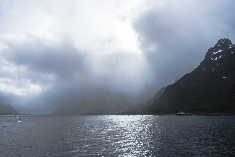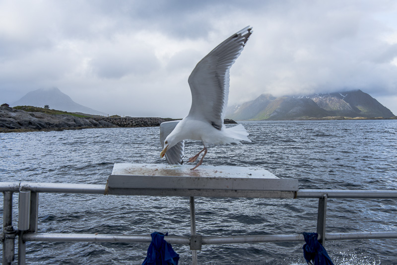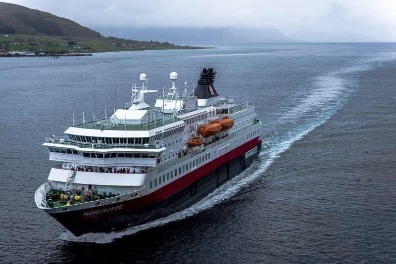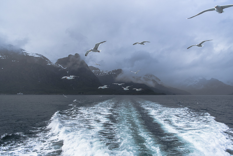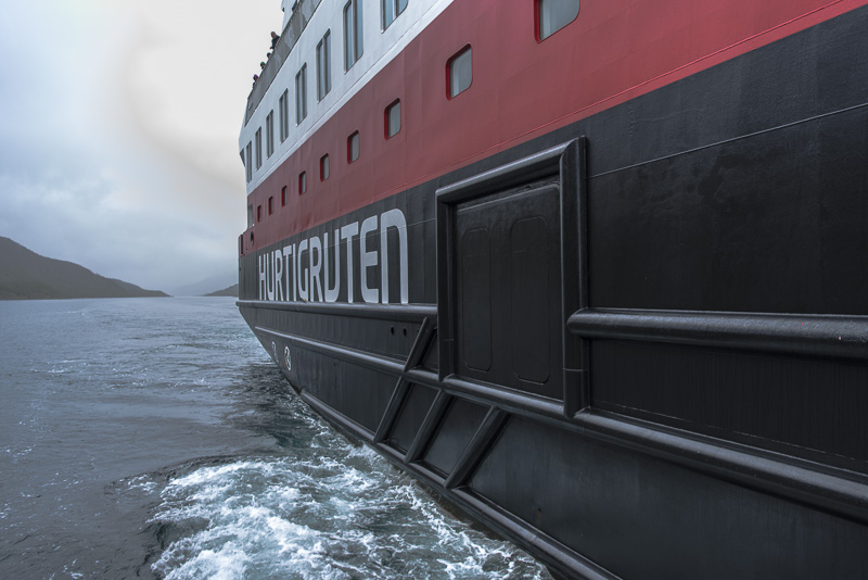 Um 13 Uhr geht es wieder mit dem Schiff weiter, und wir genehmigen uns ein Mittagessen am vorzüglichen Buffett. Danach zieht es zu, und Nieselregen beginnt. Ich ziehe mich daher wieder in die Kabine zurück, Stokmarknes und das Hurtigrutenmuseum interessieren mich - vor allem bei diesem Wetter - nicht. Erst um 16 Uhr gehe ich wieder an Deck.