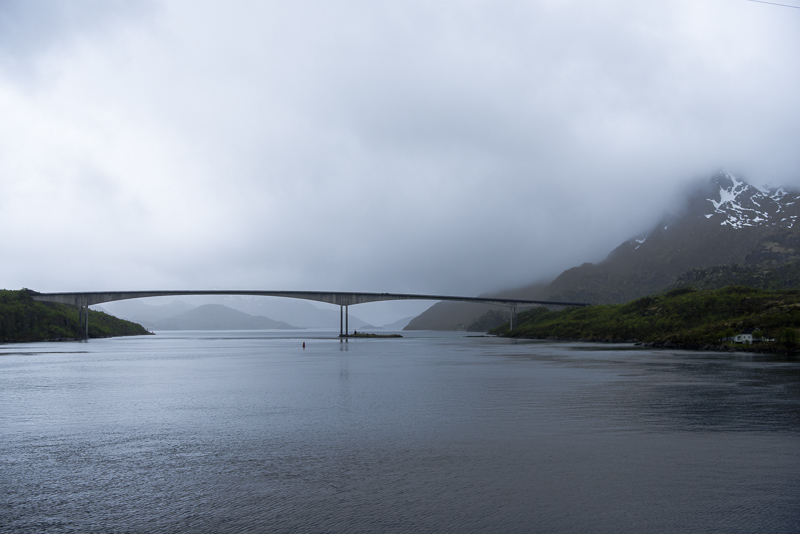 Einfahrt in den Raftsund, der bei Hanøyvika von einer Brücke überspannt wird.