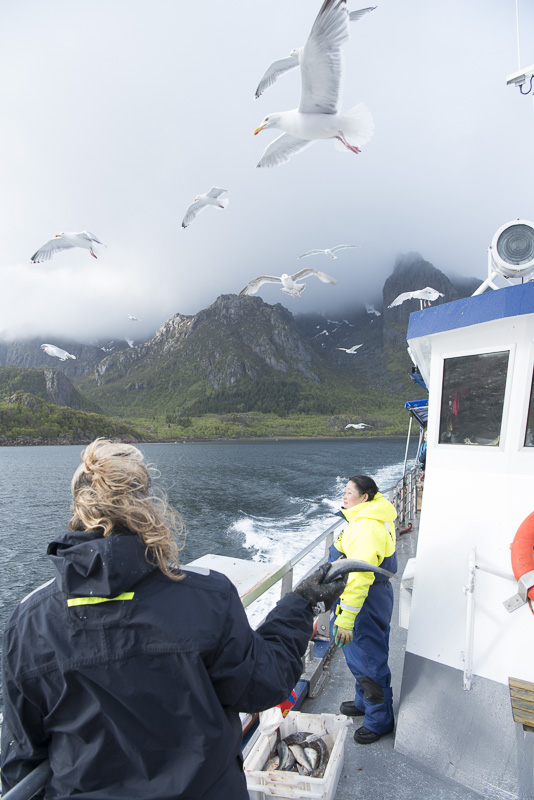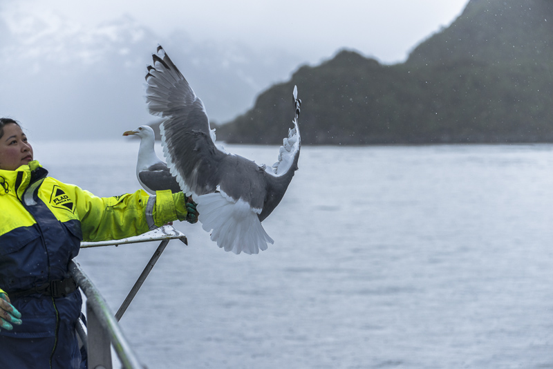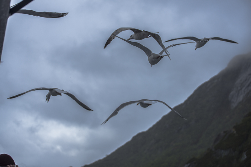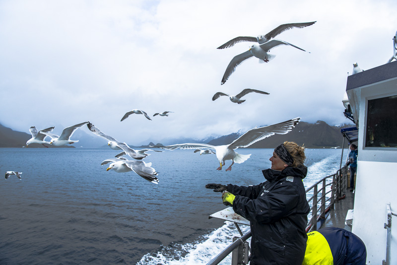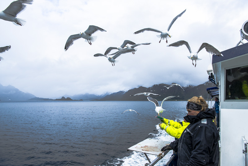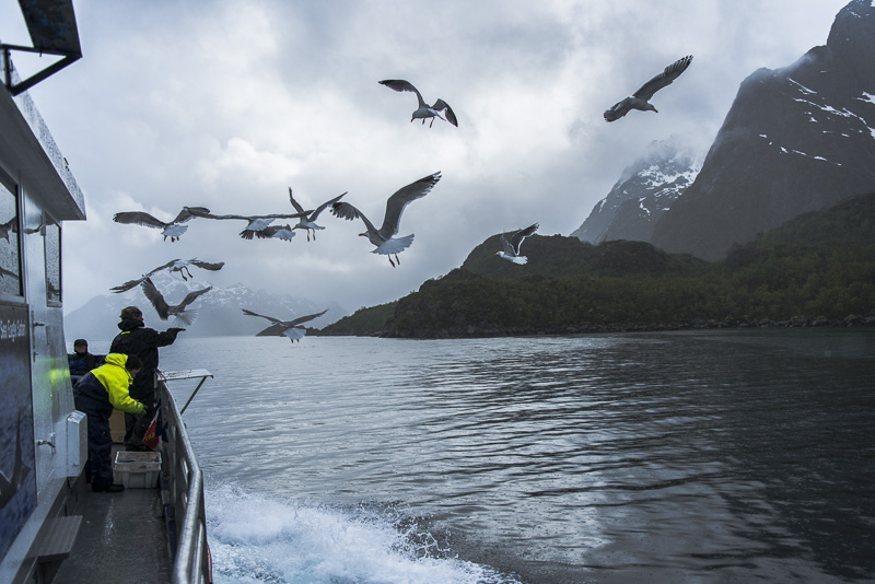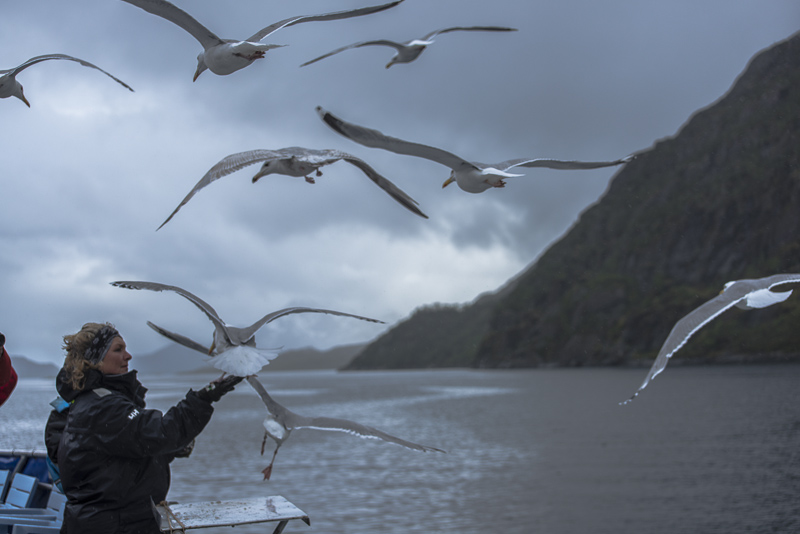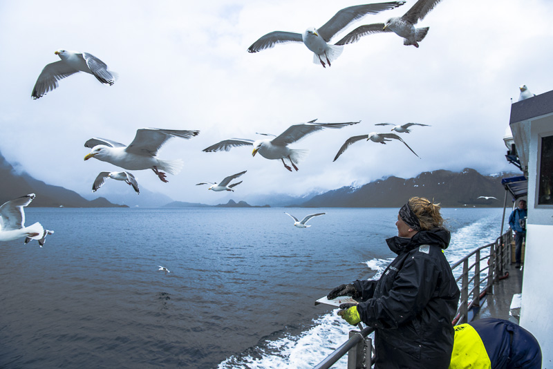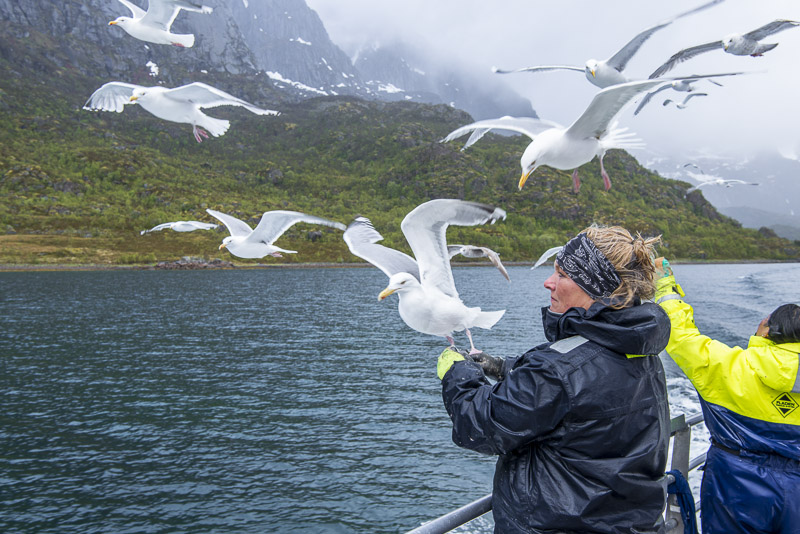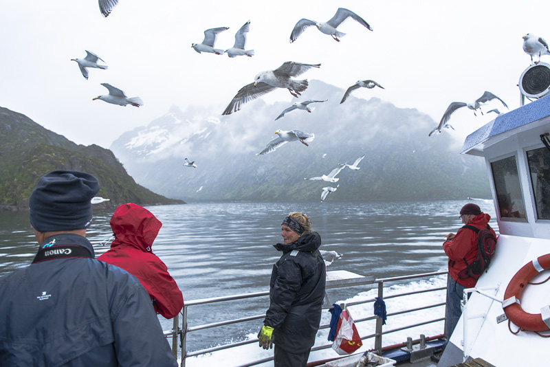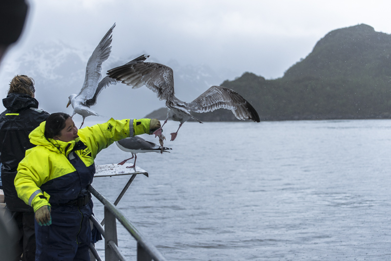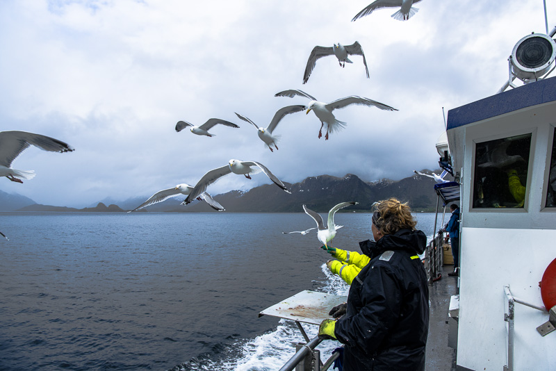 Das Ausflugsboot hat einen für Möwen reich gedeckten Tisch. Sie werden mit Fischstückchen gefüttert und umschwirren in großer Zahl unser Boot.