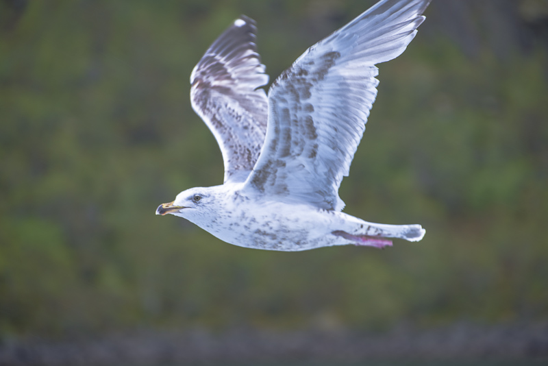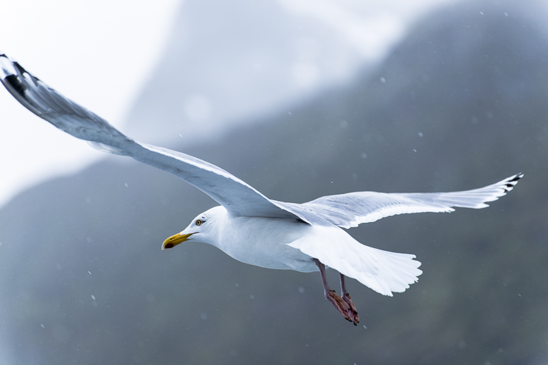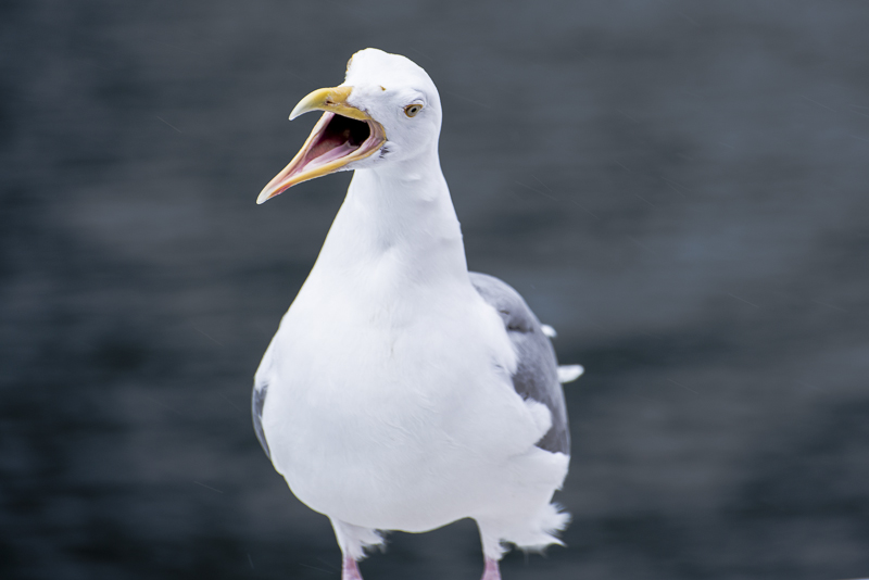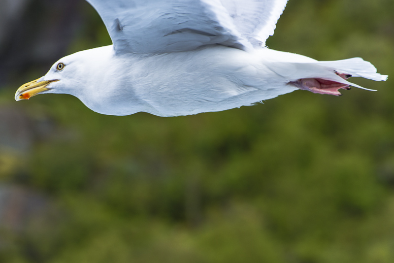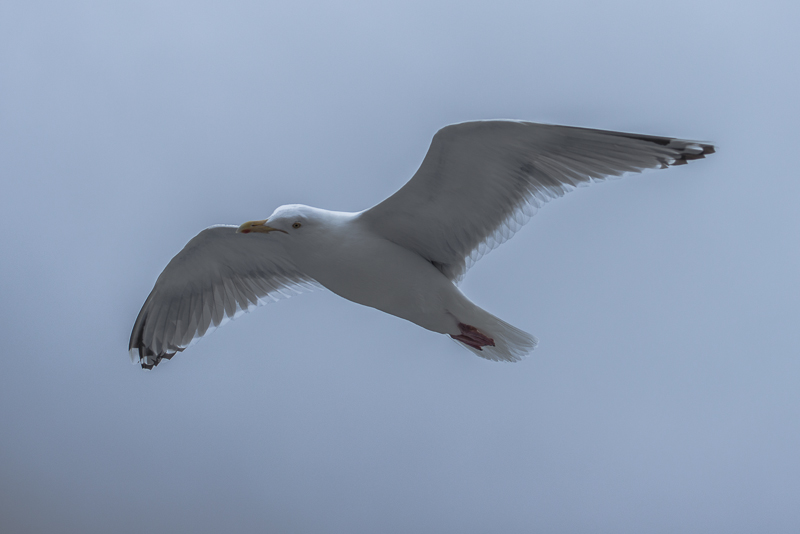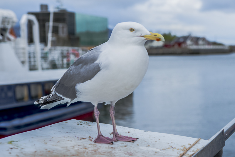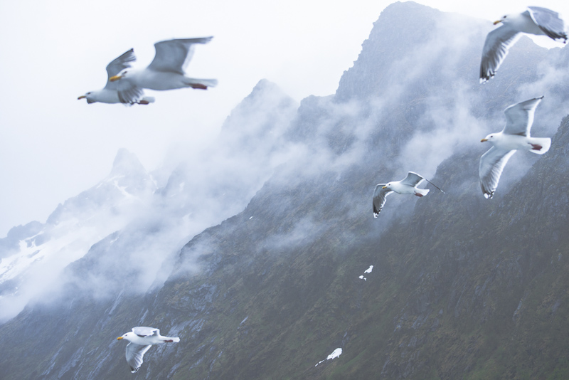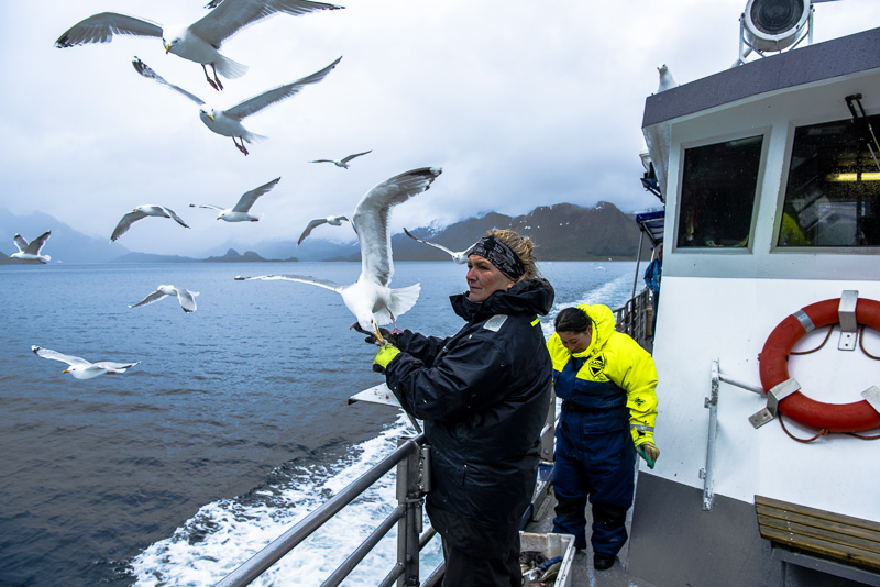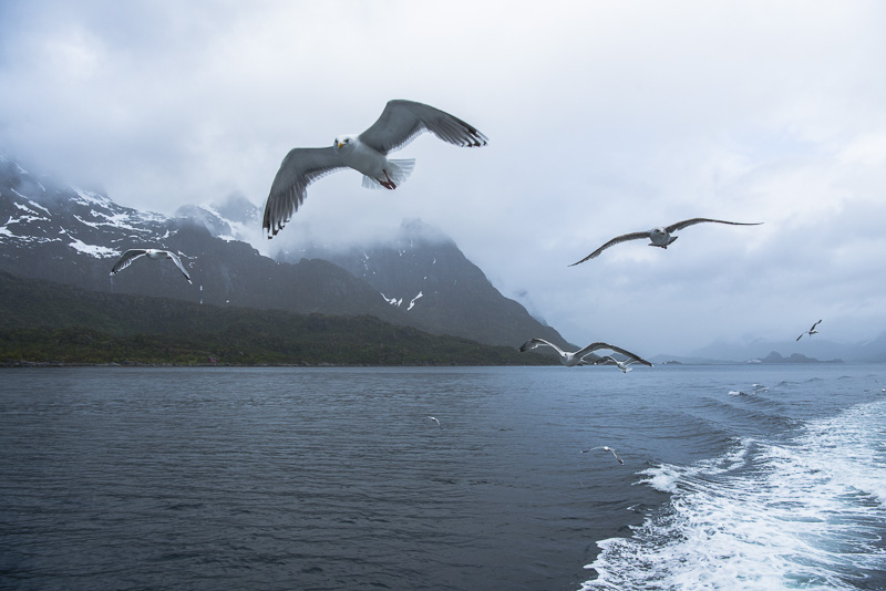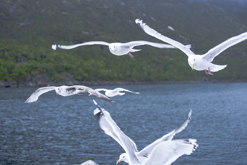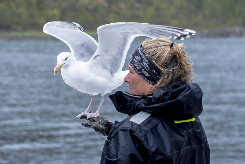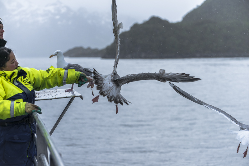 Das Ausflugsboot hat einen für Möwen reich gedeckten Tisch. Sie werden mit Fischstückchen gefüttert und umschwirren in großer Zahl unser Boot.