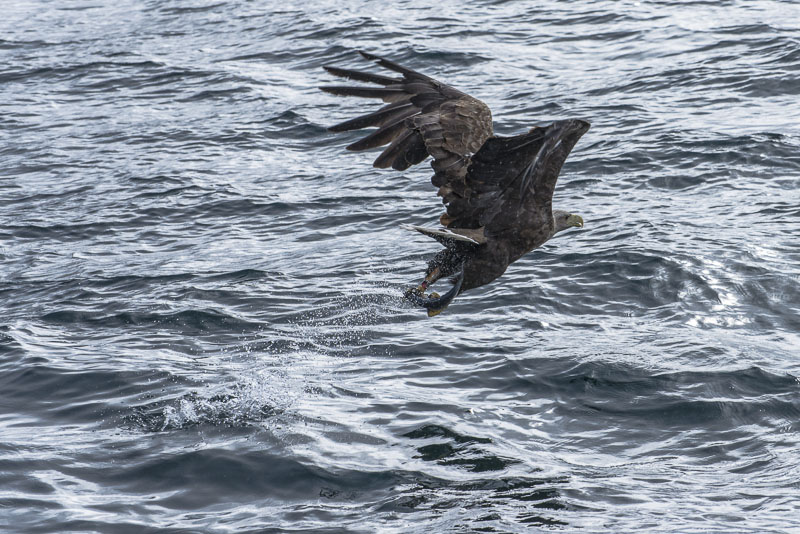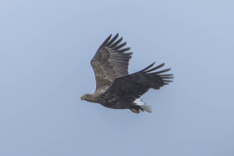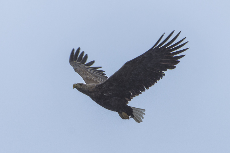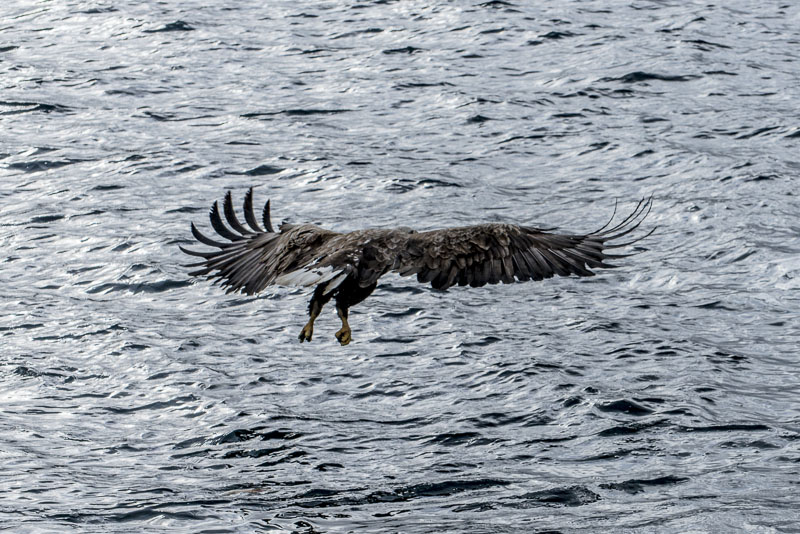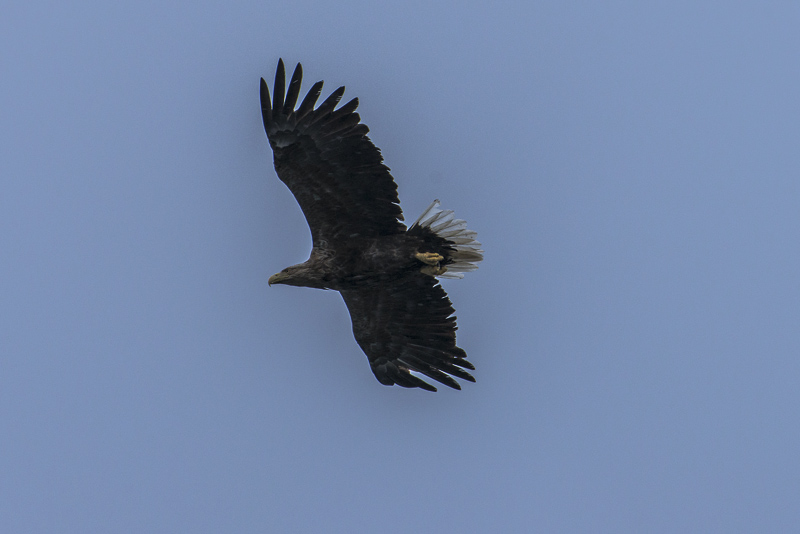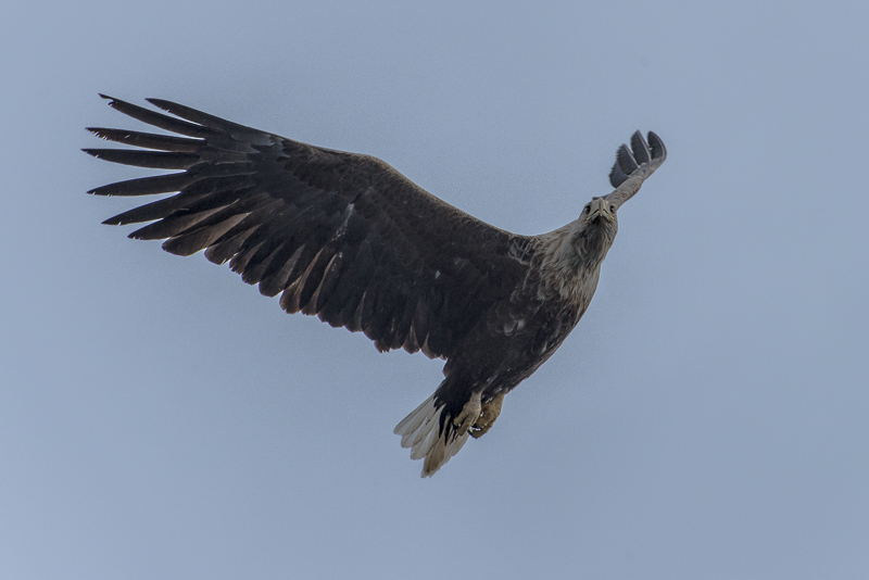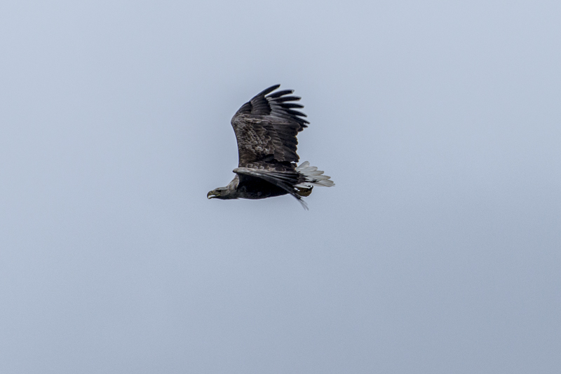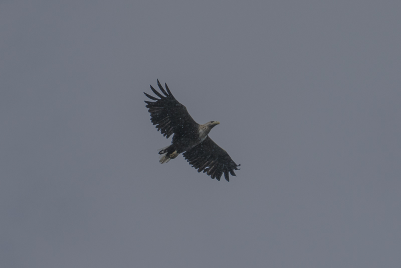 Angelockt von dem Möwenschwarm erscheint jetzt ein größerer Vogel: ein Weißschwanzseeadler (Haliaeetus albicilla).