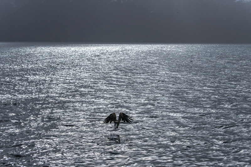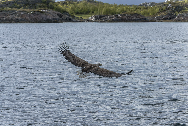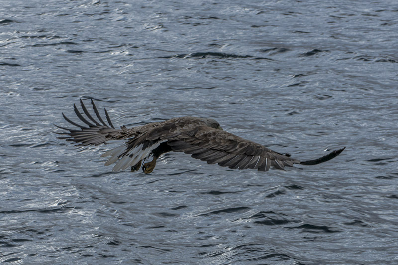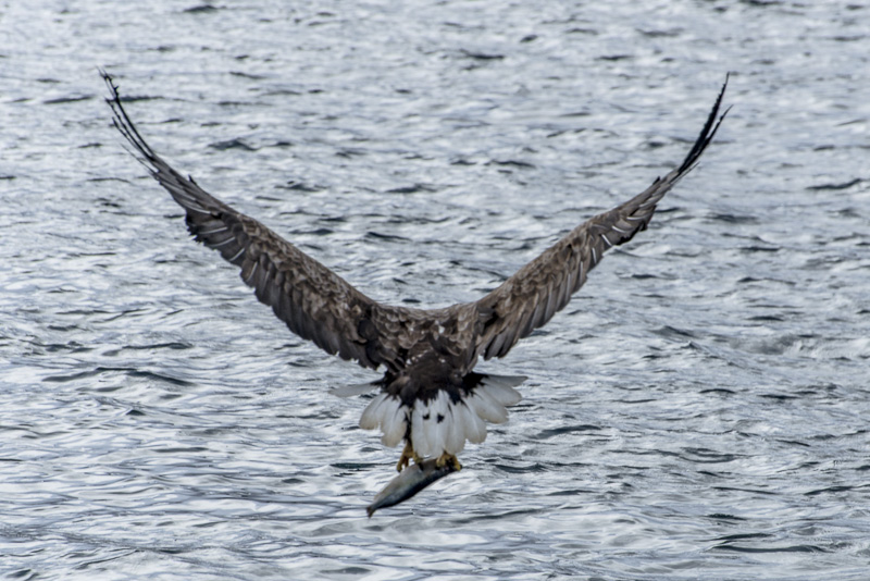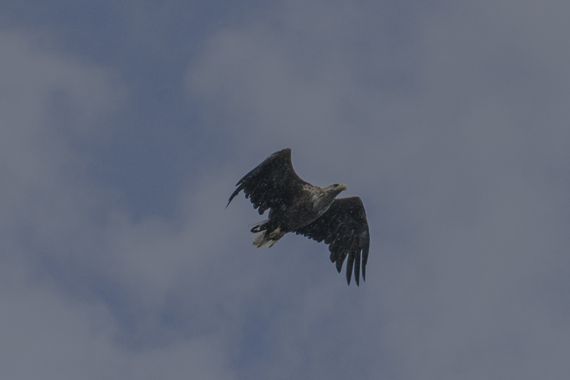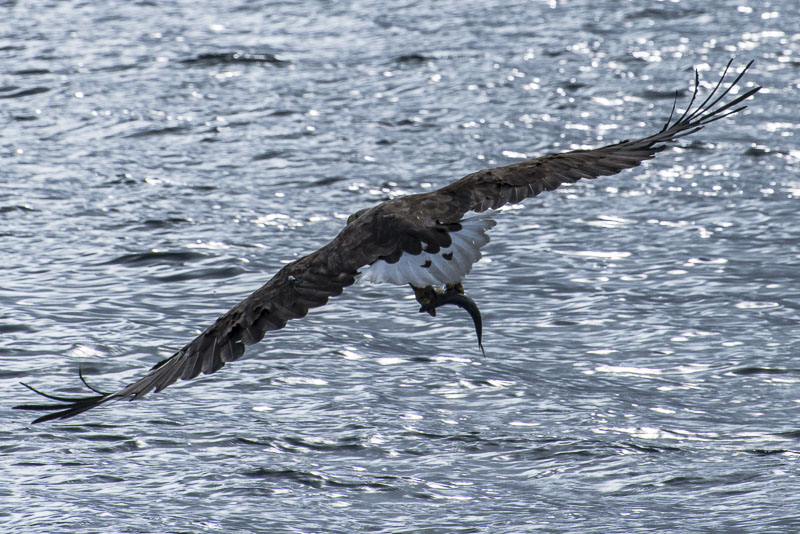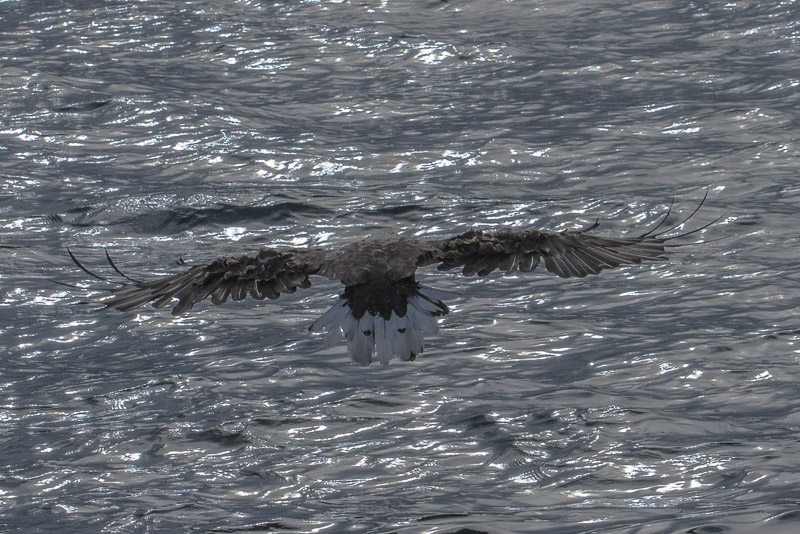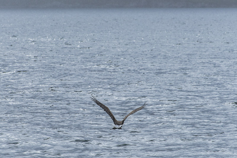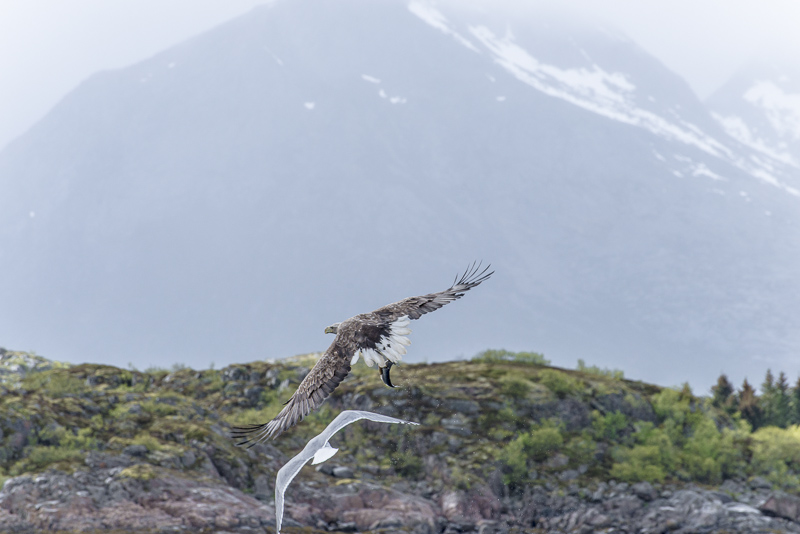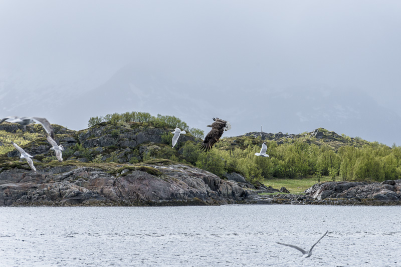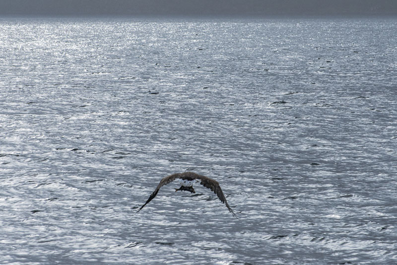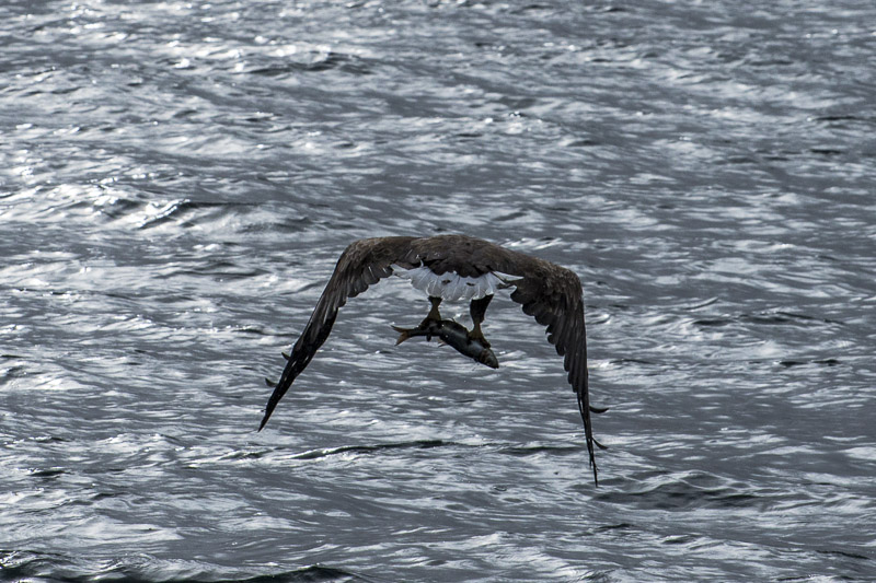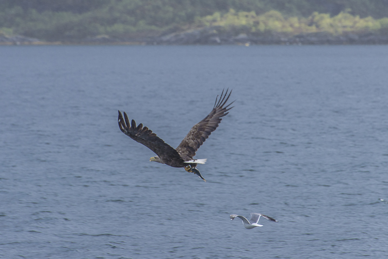 Diese Möwe verfolgt den Adler. Scheinbar ist es schon vorgekommen, dass er seine Beute verliert, und die Möwe ist sicher um vieles wendiger und flinker und holt sich dann den Fisch - oder zumindest Teile davon.