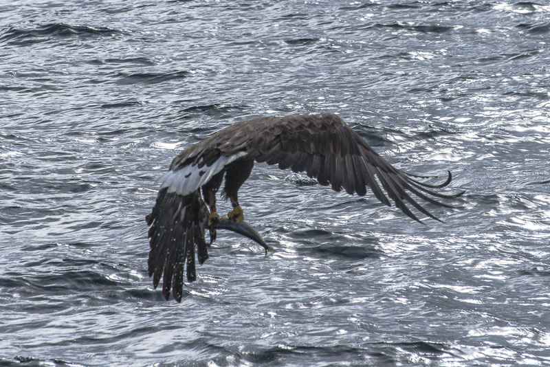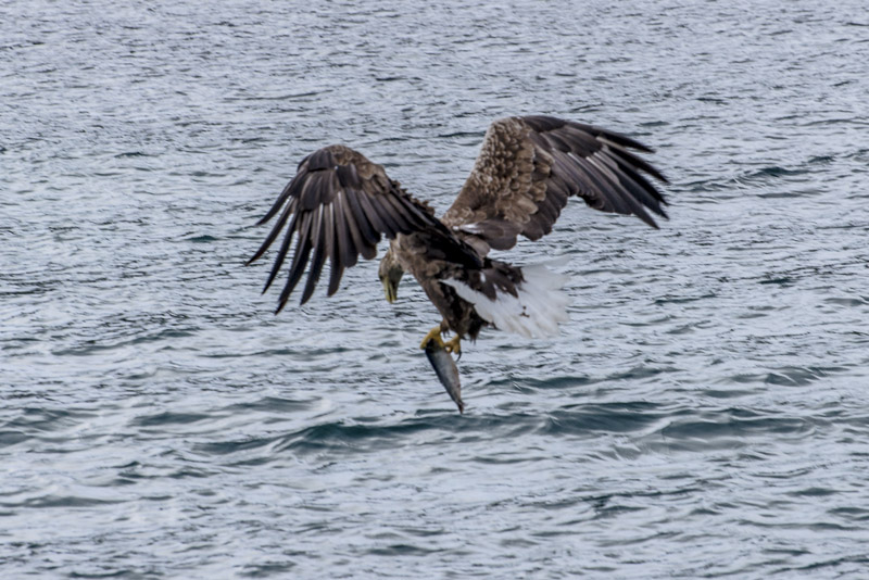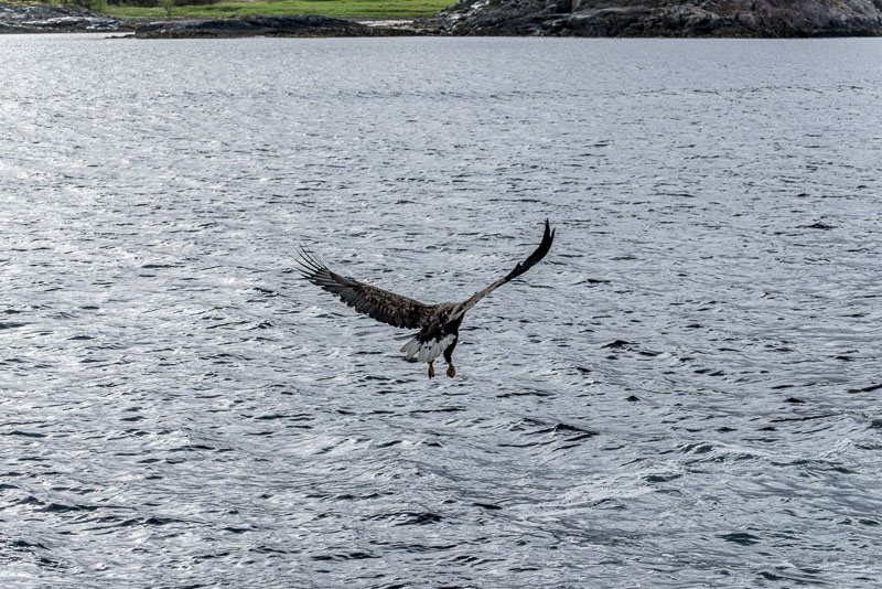 Um 16:30 werden wir zu unserer nächsten heutigen Tour gerufen, der "Seeadlersafari". Bei voller Fahrt legt die Mannschaft zu dem parallel neben unserem Schiff fahrenden Ausflugsboot eine Brücke, und wir können hinüber spazieren. Ein bisschen mulmig wird es einem dabei schon ...