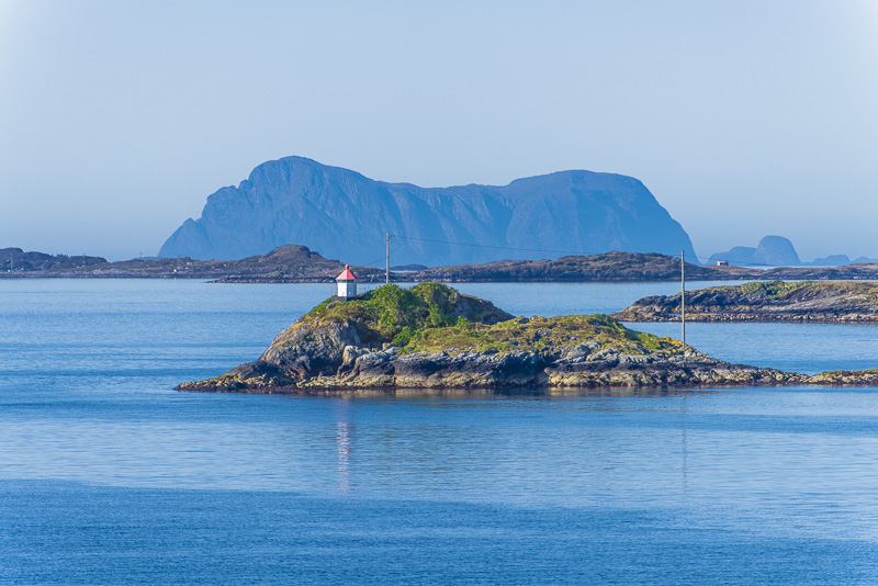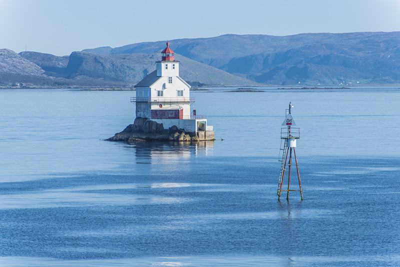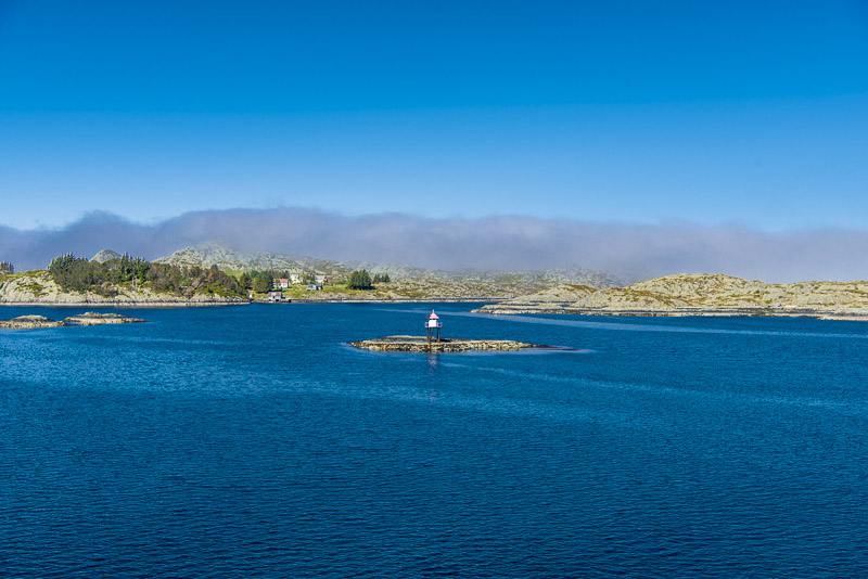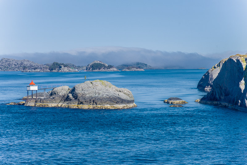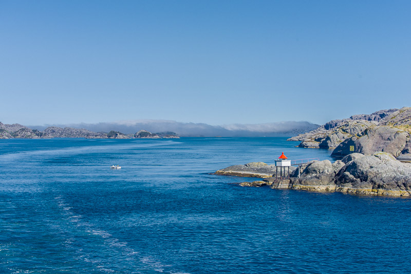 Der Leuchtturm von Stabben, auf einer winzigen Schäre erbaut, zieht rechts vorbei.
