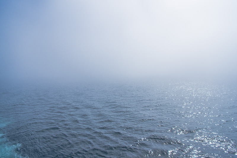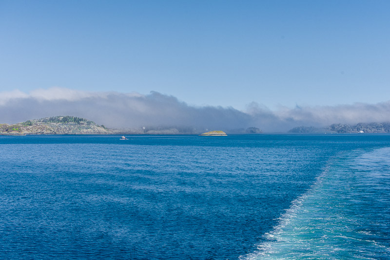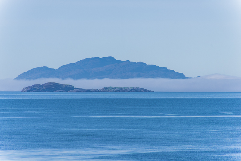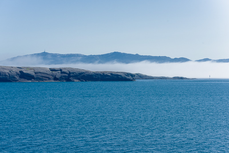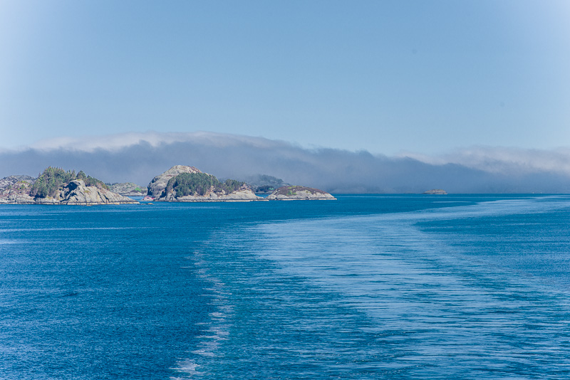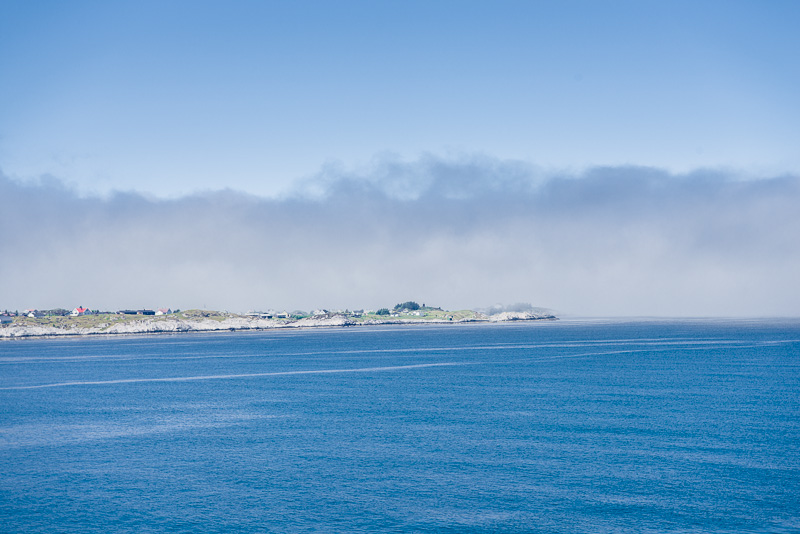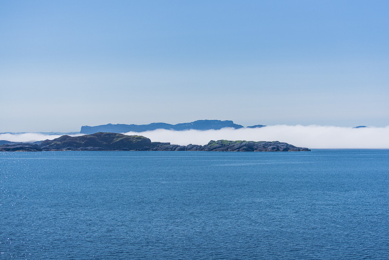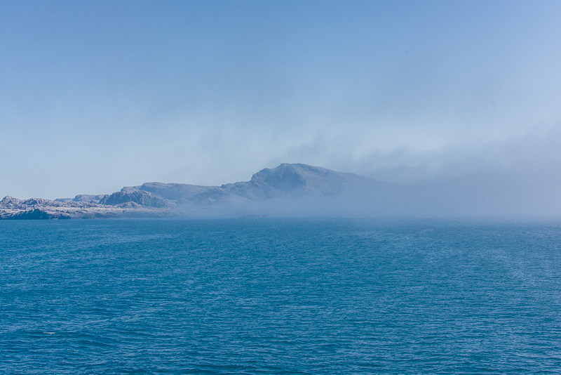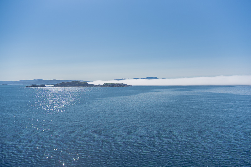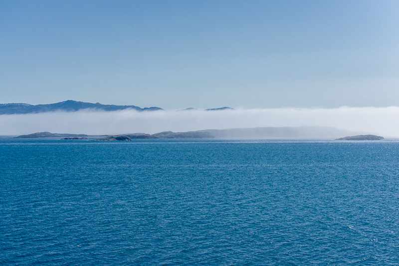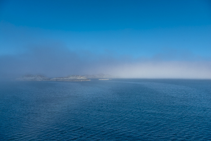 Auf der rechten Seite wieder Schären und niedrige Inseln, in denen der Nebel zum Teil noch hängt.