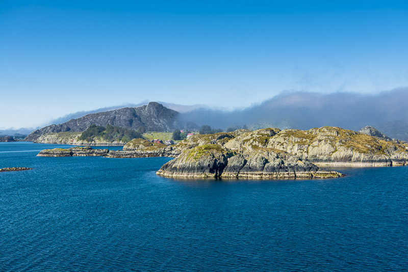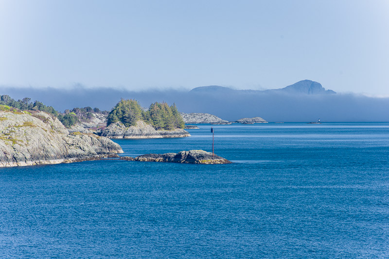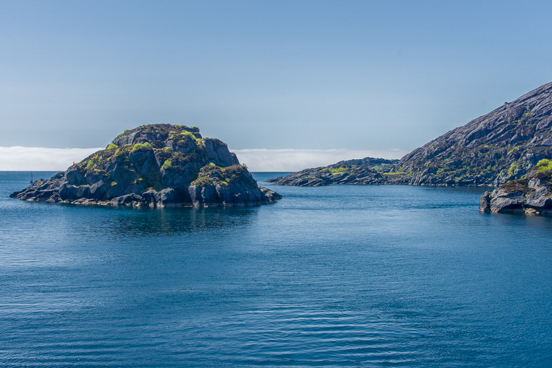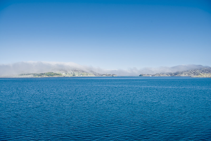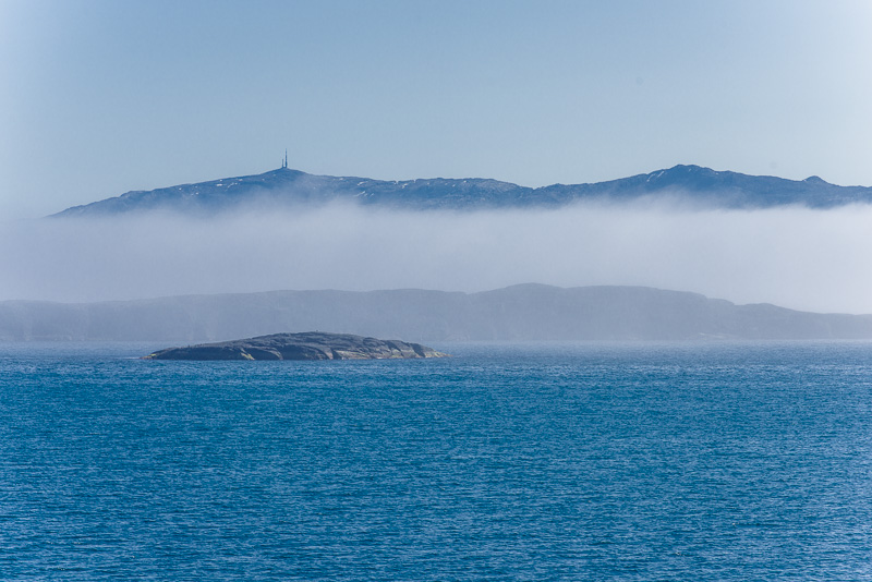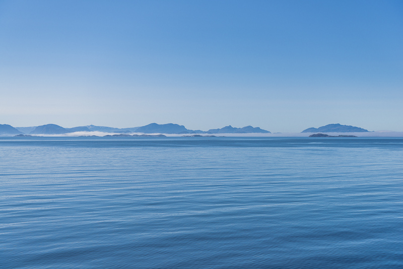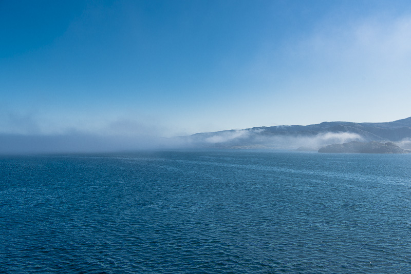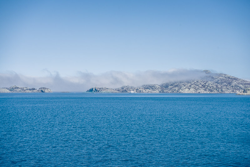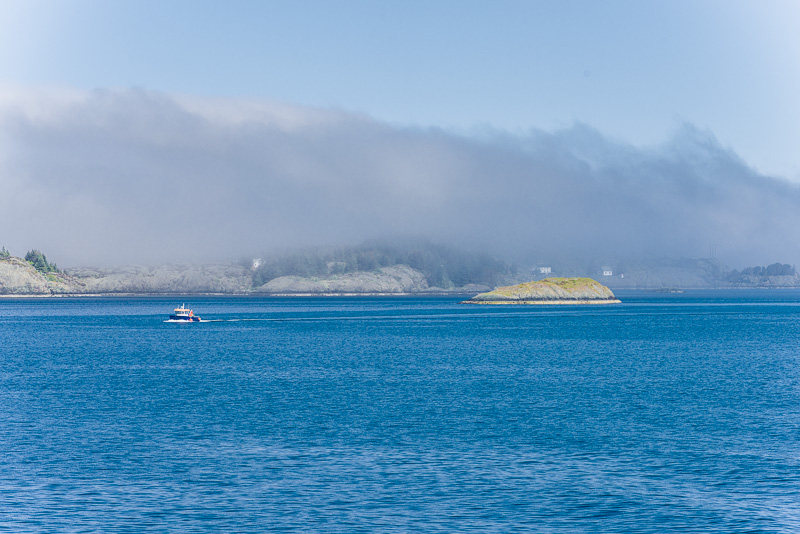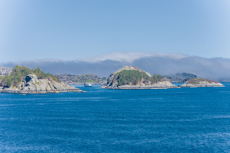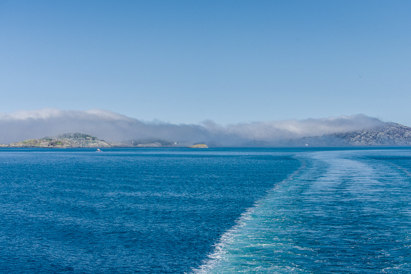 Auf der rechten Seite wieder Schären und niedrige Inseln, in denen der Nebel zum Teil noch hängt.