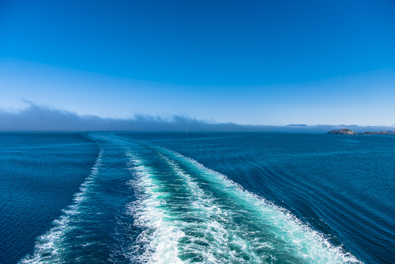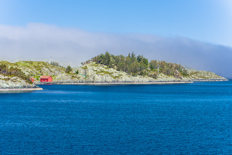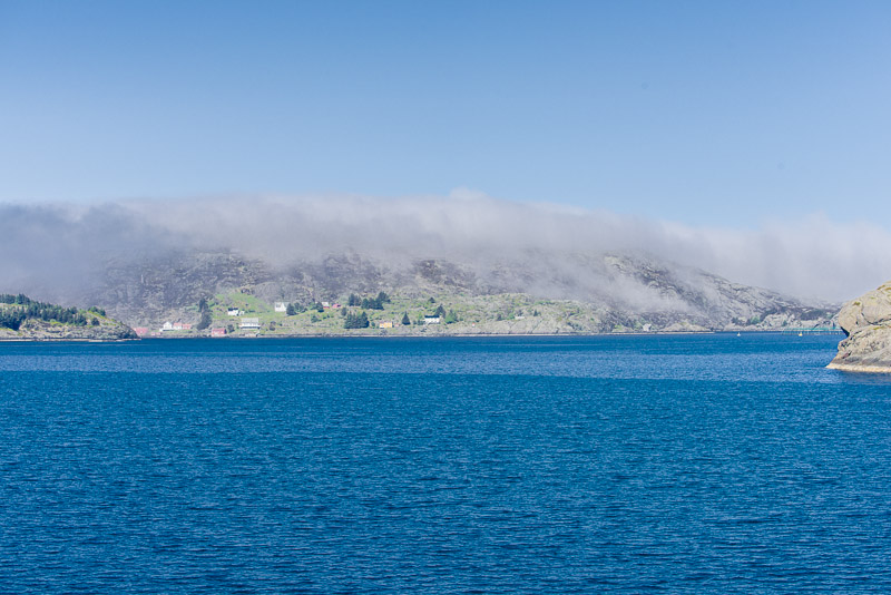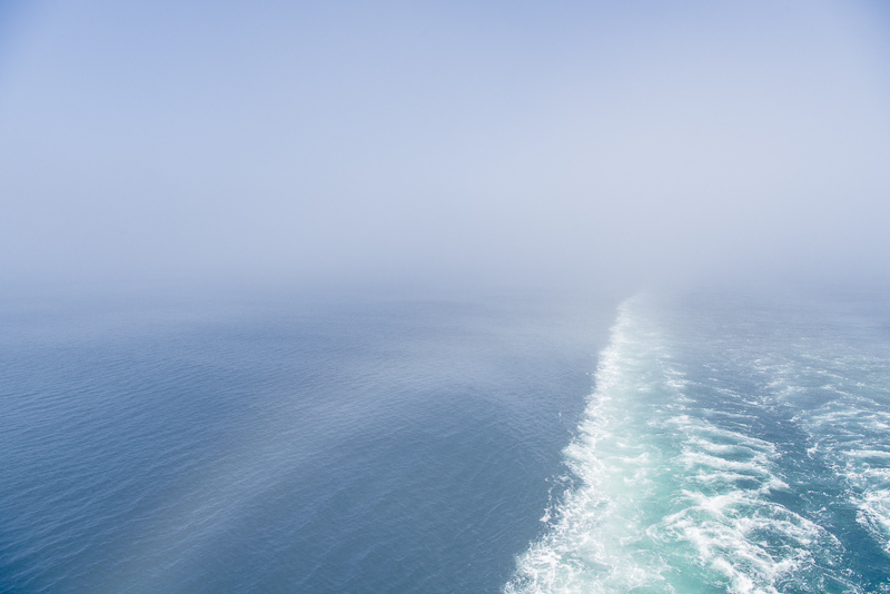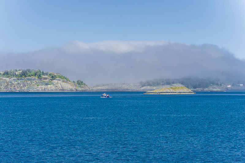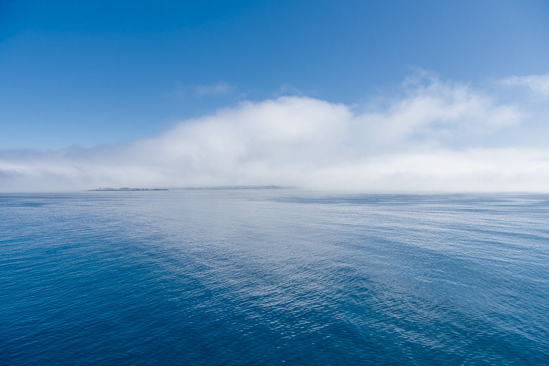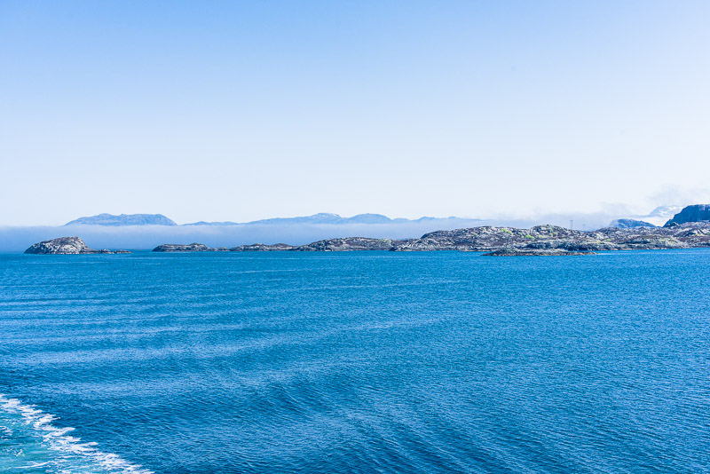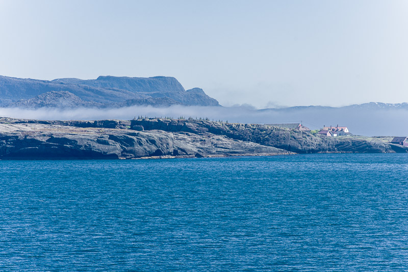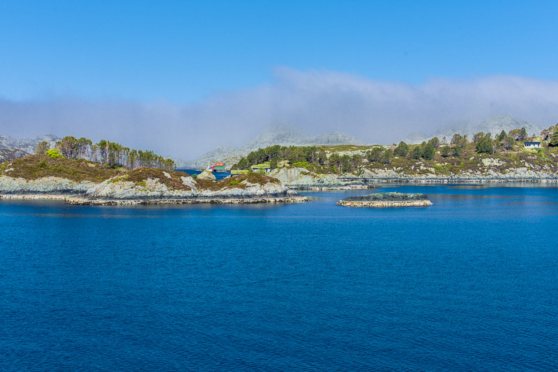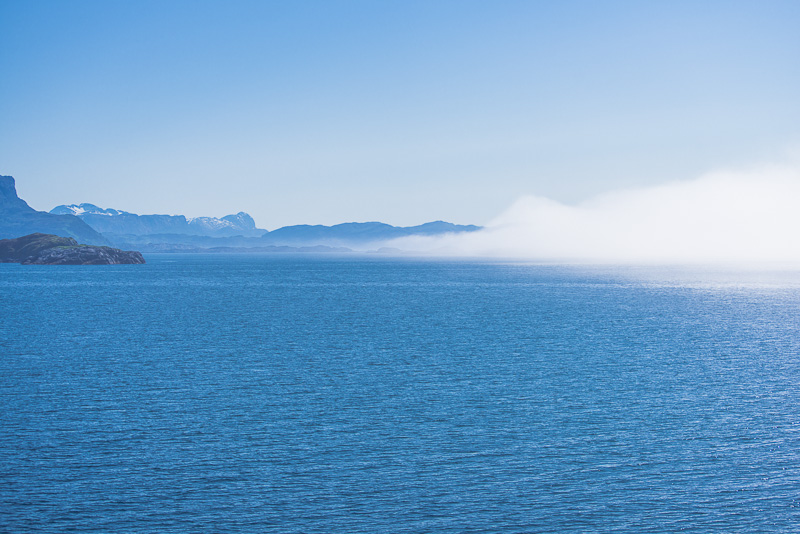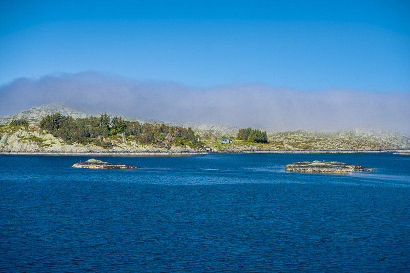 Auf der rechten Seite wieder Schären und niedrige Inseln, in denen der Nebel zum Teil noch hängt.