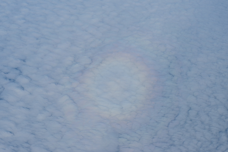 Brockenspektrum - diesmal bildet sich die Lichtbeugung am Flugzeug als Farbring auf den Wolken ab.