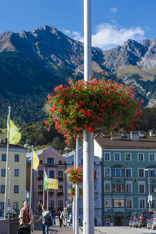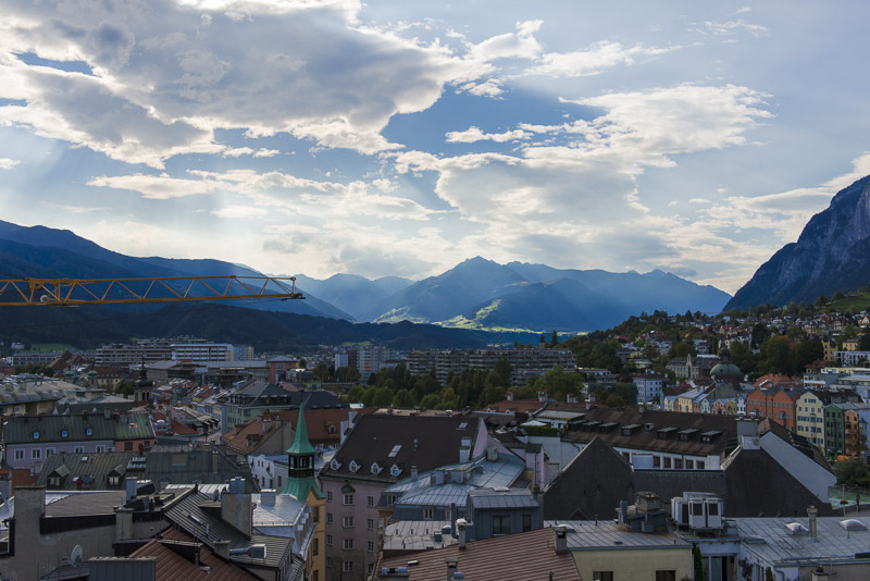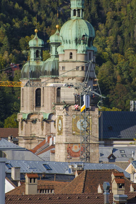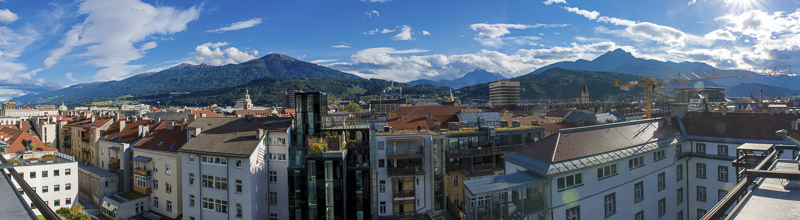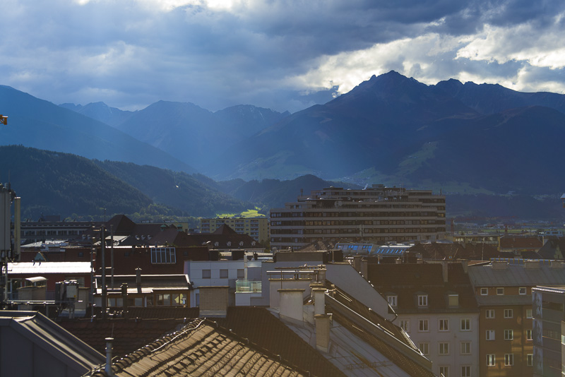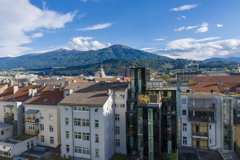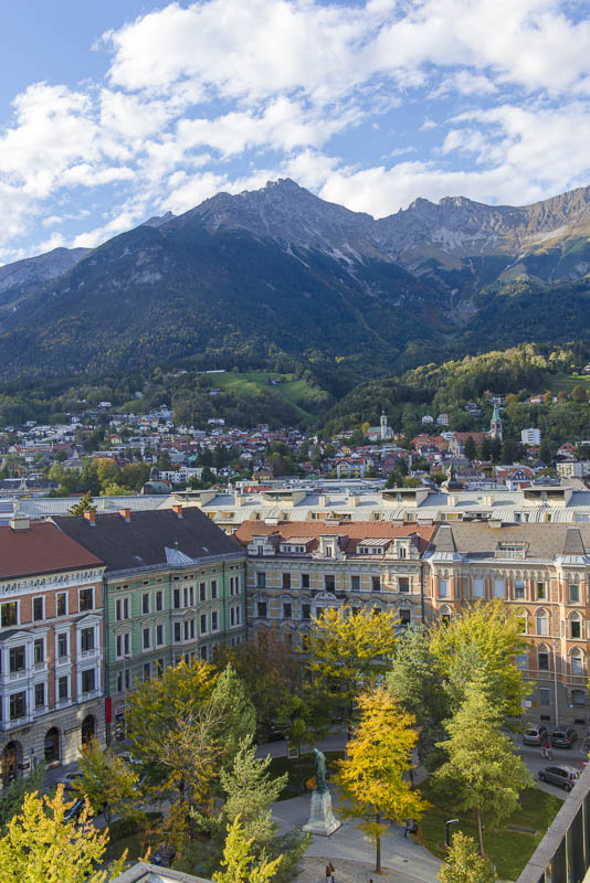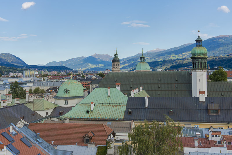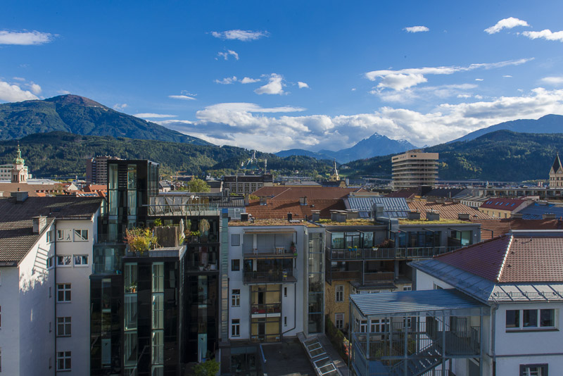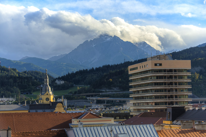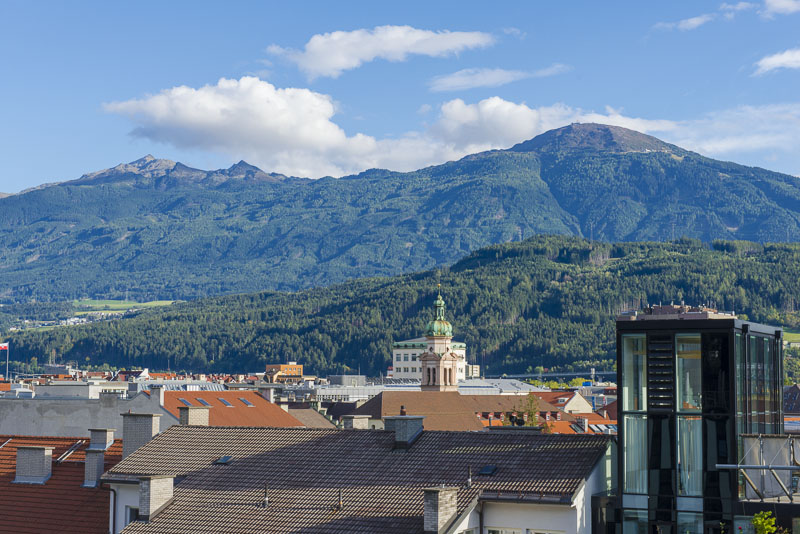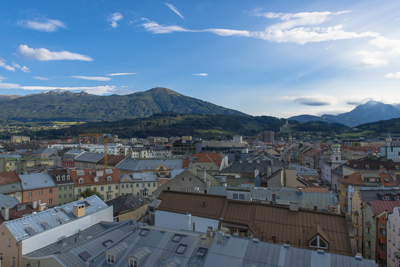 I climb the city tower in the old town near the Goldenes Dachl. A wonderful view from here to the south. Far left is the snow covered Glungezer (2.677 m), in the centre the Patscherkofel (2.246 m), where Olymic ski downhill raced were permormed in 1964 and 1976. Far right the Serles (2.717 m) with foen clouds.