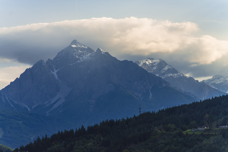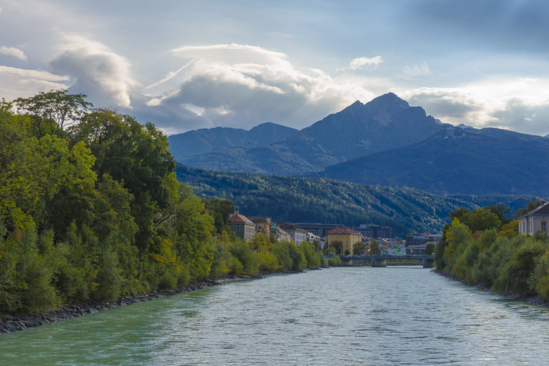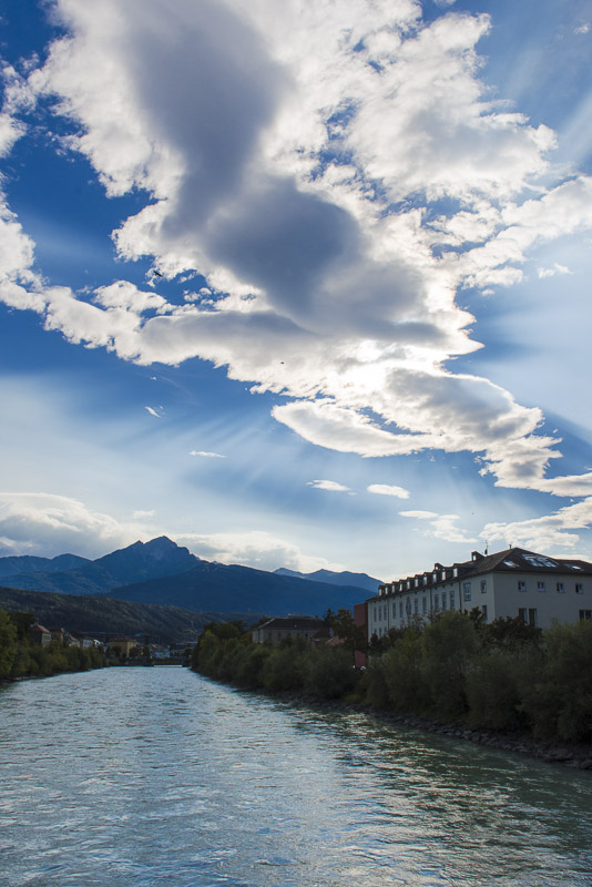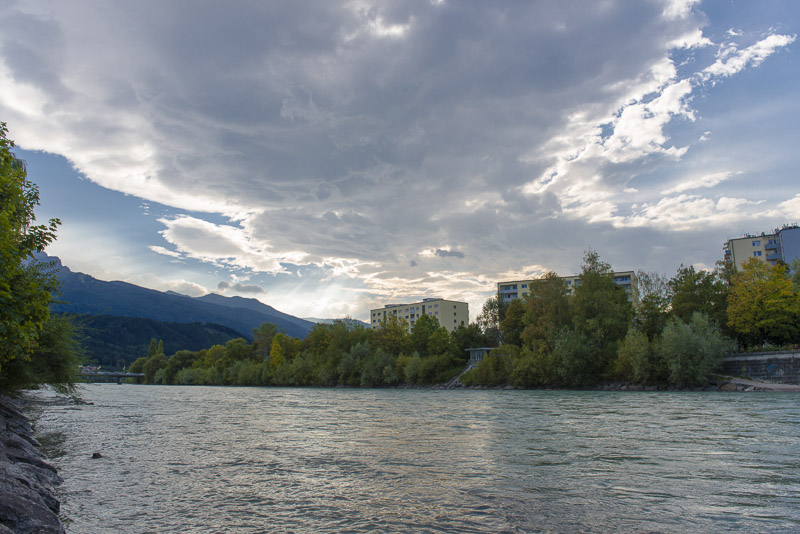 View upwards the Inn to the Kalkkögel. Behind is the typical cloud jam of the foen weather situation. Clouds coming in from the South are jammed at the main Alpine ridge, cooled down when elevated and thus lose their moisture due to heavy rain in southern Tyrol. The condensation energy then warms up the dried air, which falls down to the valley and heats it. At early October, the temperature is now up to 23 °C.