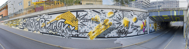 Works of art on the walls of this underpass for pedestrians and cyclers.