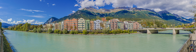 After checking out of our hotel, once more a short walk to the town. The foen still is alive, and the weather is even better than yesterday. This is a panoramic picture of the Inn with the Northern ridge. Click here or into the picture for a larger display.