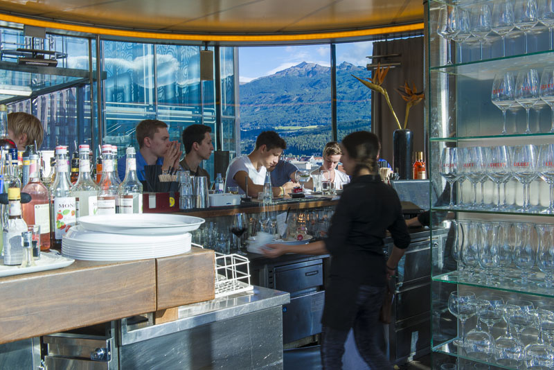 The circular bar, behind the glass surrounded by cosy seats.