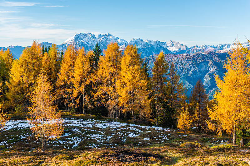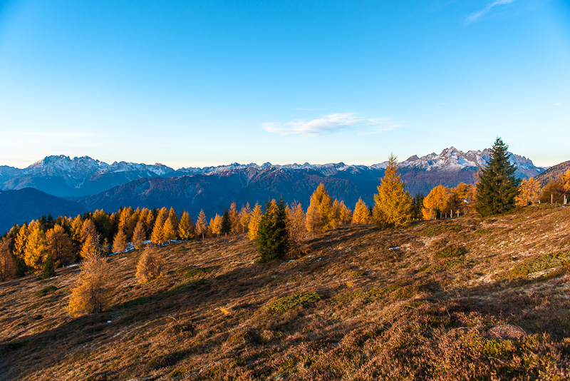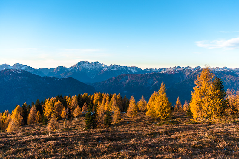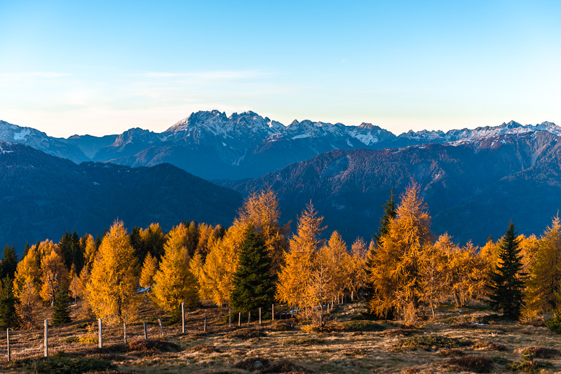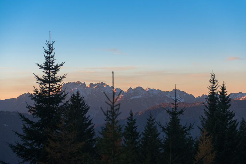 I started from the hotel at 7 a.m. and arrived on the Alm at 7:15 a.m., so at this season, it is still a bit dark. Only some summits of the Karnische Alps are already lit by the sun.