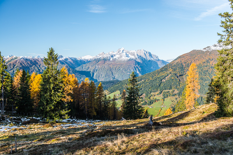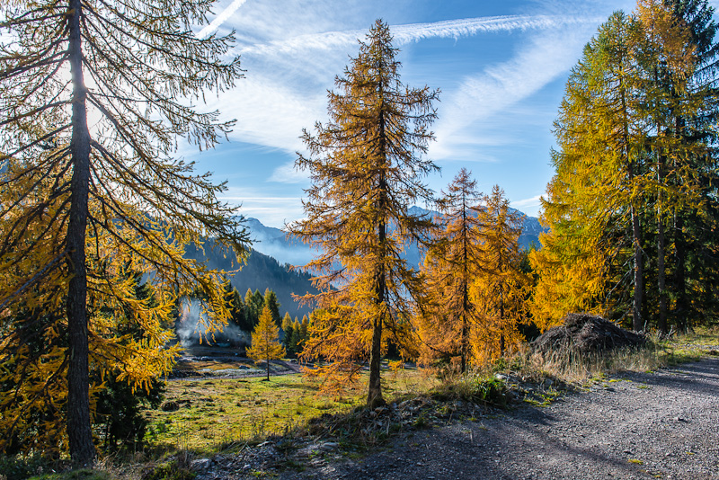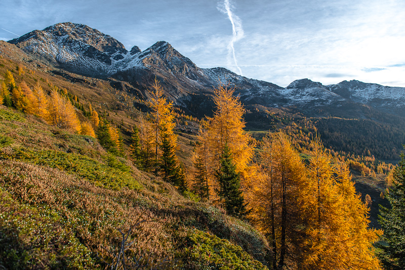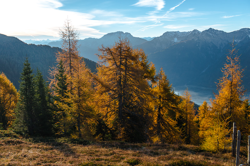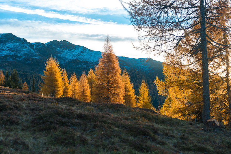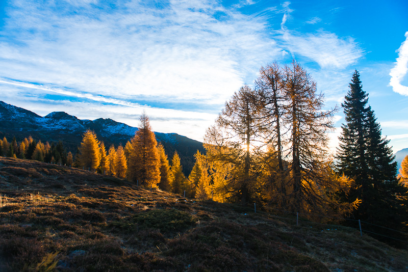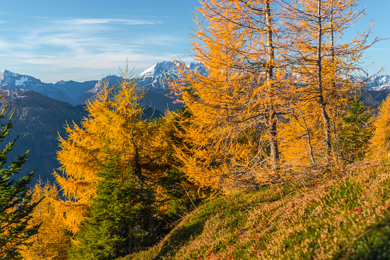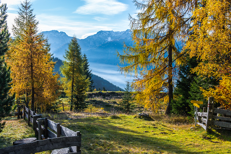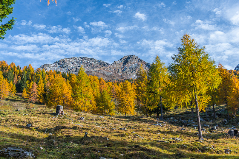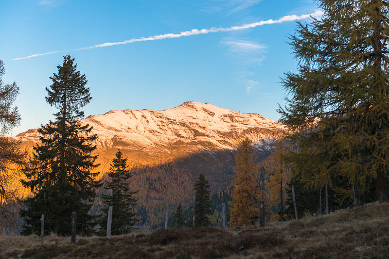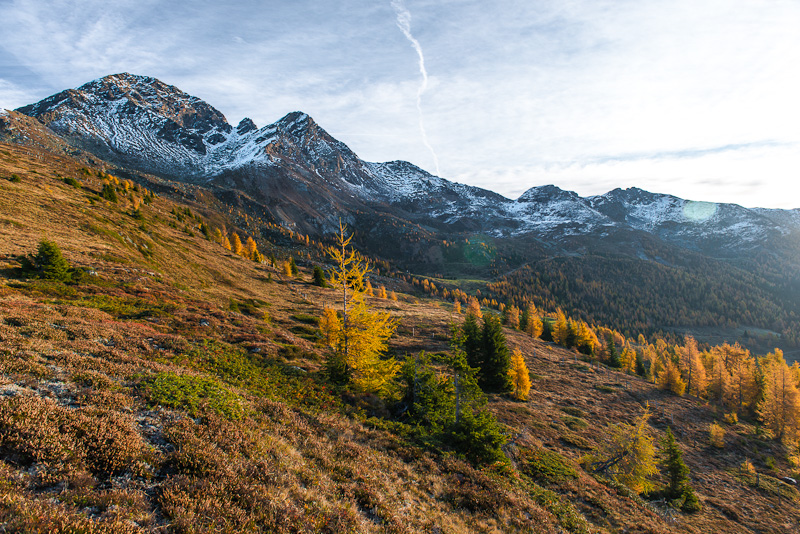 After about 45 minutes walk I reach the area of the Alm Zelin, where I turn to the right and walk up the grass. Sunlight on the nearby Schmaßkofel (2.330 m).