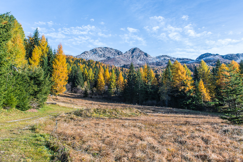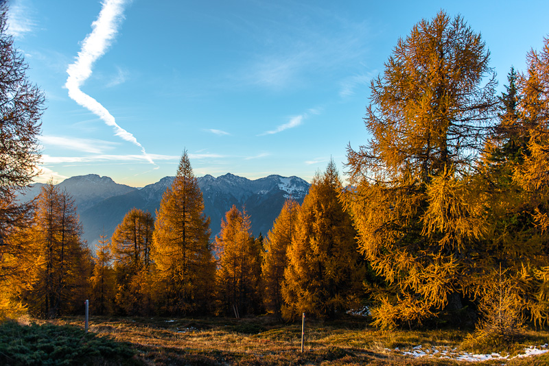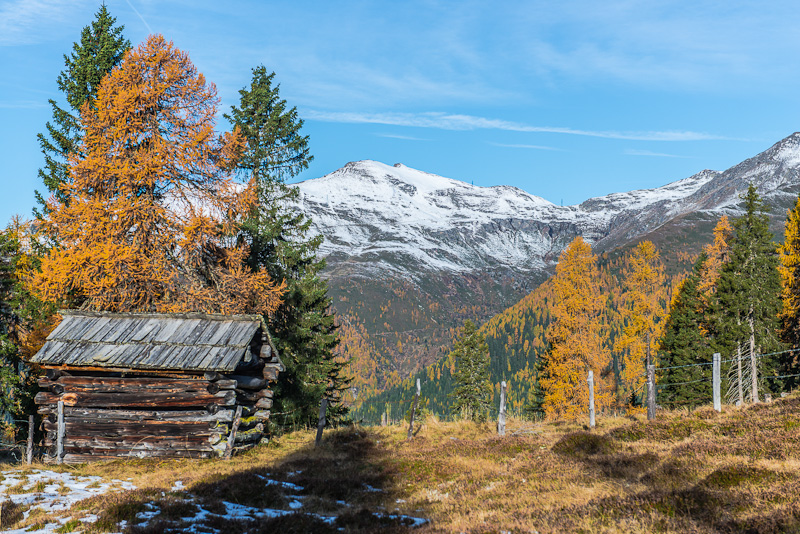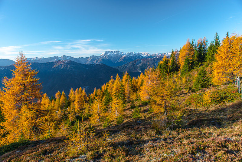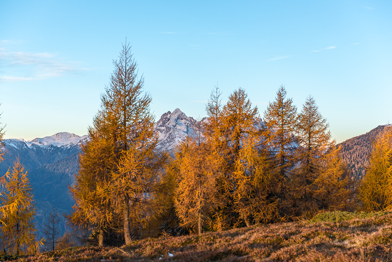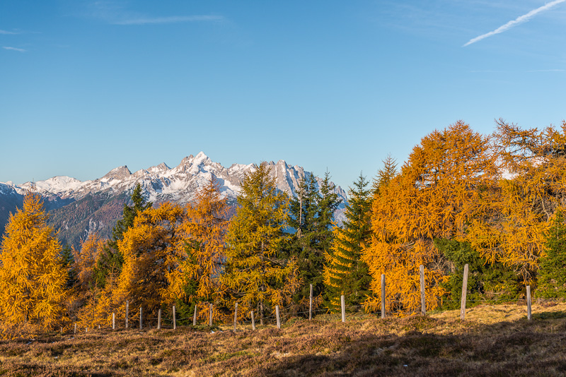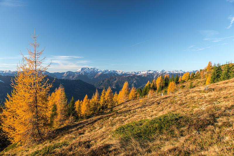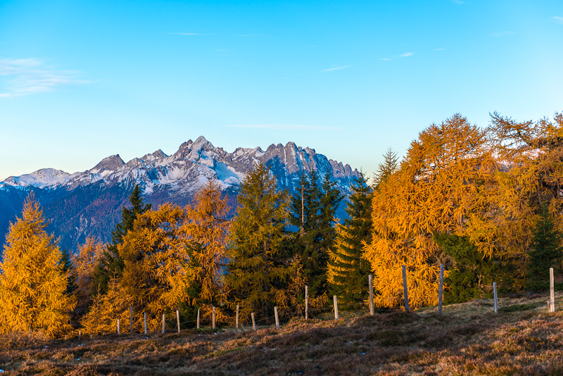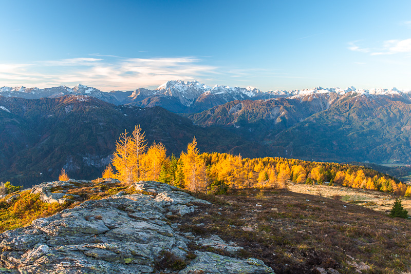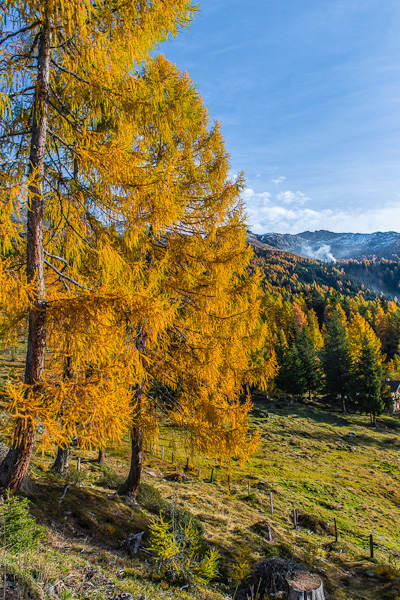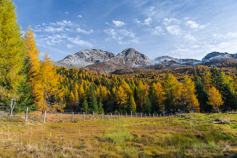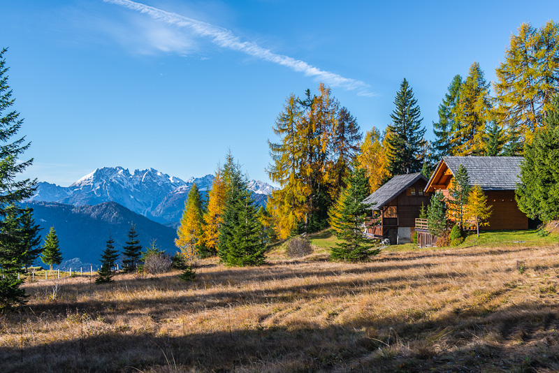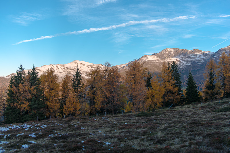We are invited to a wedding in Irschen, Upper Carinthia, situated on a south slope above the Drau valley, about 5 km from the border to Eastern Tyrol and 24 km from Lienz. Wheras Winzendorf is covered by mist, here the sun is shining all day. The feast begins at 11 a.m., so we arrived the evening before. This gave me the opportunity to make use of an early sunny morning and take the car to drive up a good mountain road to the Leppner Alm above Irschen, on the Southwestern slopes of the Kreuzeck group, to do a short morning walk already from an altitude of 1.613 m.