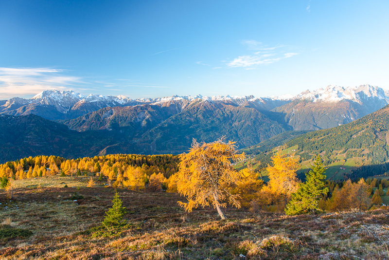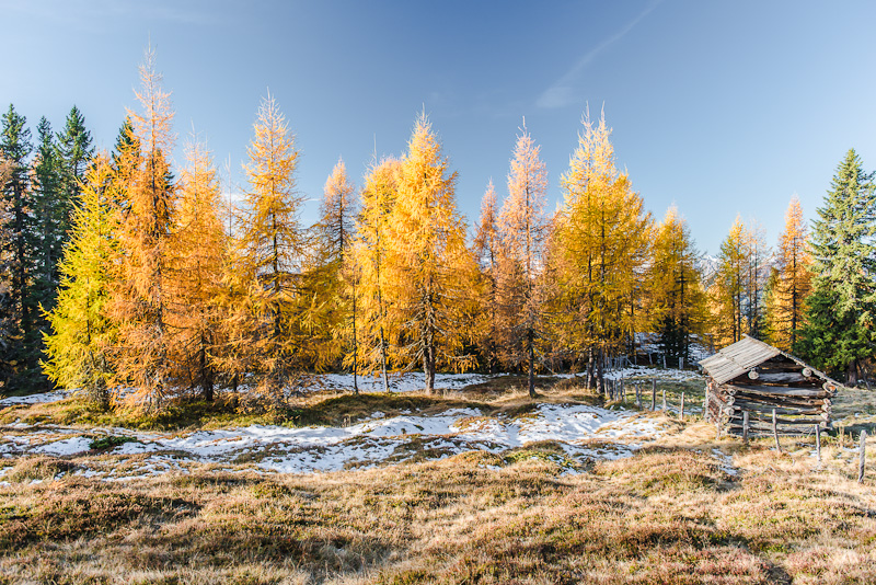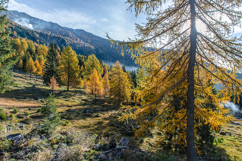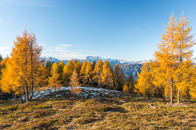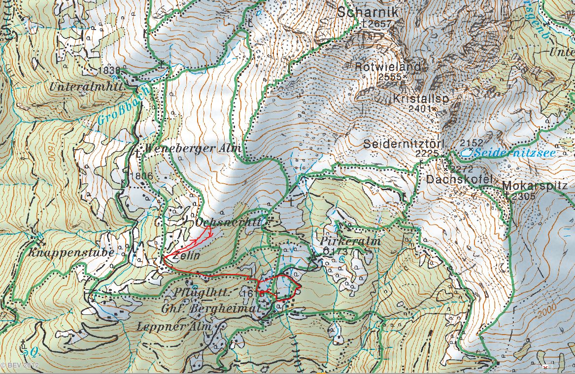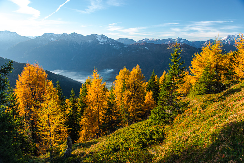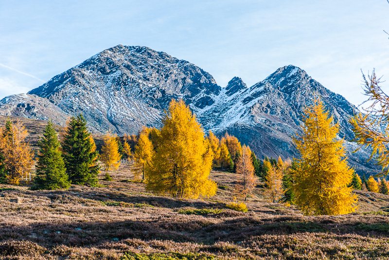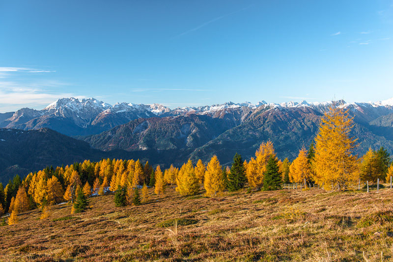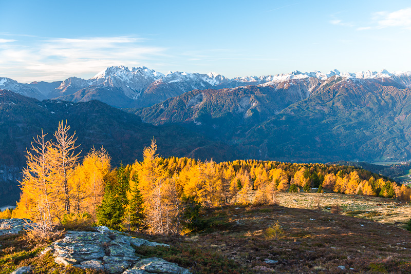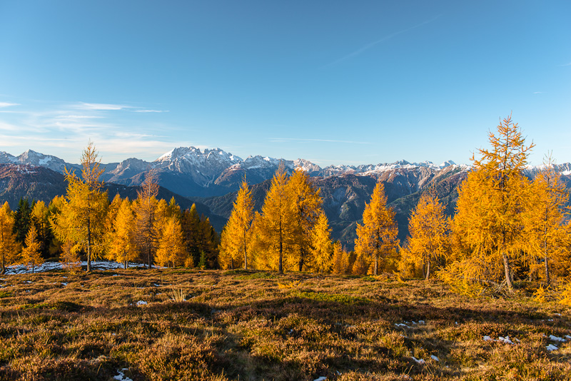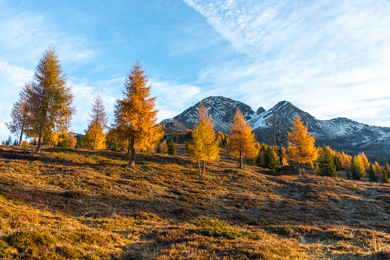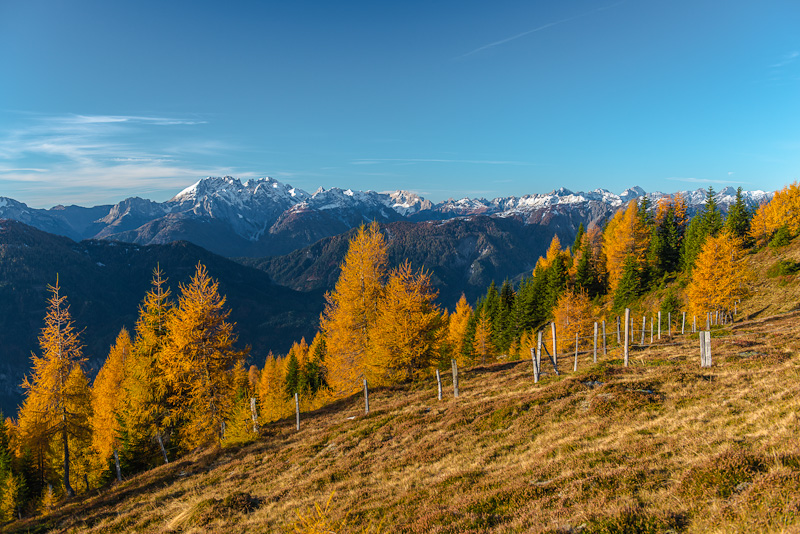 We are invited to a wedding in Irschen, Upper Carinthia, situated on a south slope above the Drau valley, about 5 km from the border to Eastern Tyrol and 24 km from Lienz. Wheras Winzendorf is covered by mist, here the sun is shining all day. The feast begins at 11 a.m., so we arrived the evening before. This gave me the opportunity to make use of an early sunny morning and take the car to drive up a good mountain road to the Leppner Alm above Irschen, on the Southwestern slopes of the Kreuzeck group, to do a short morning walk already from an altitude of 1.613 m.