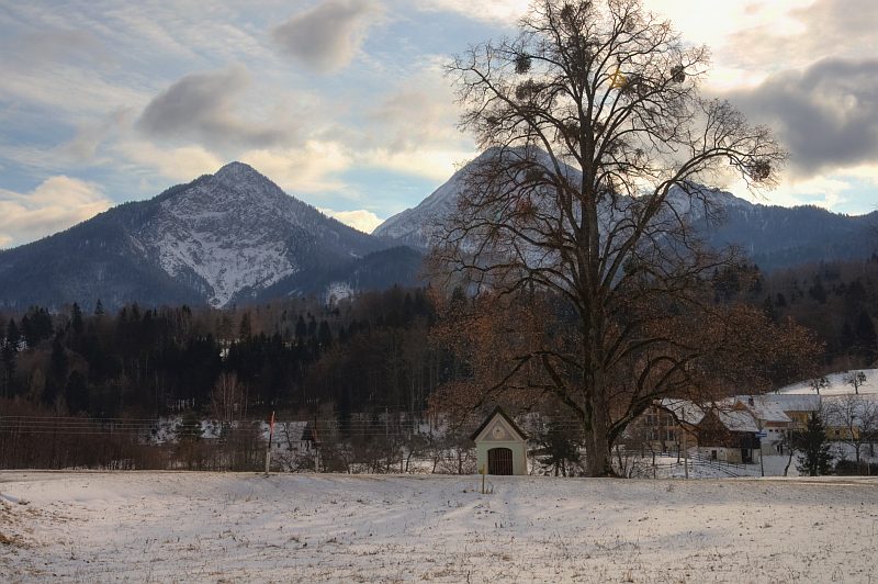 Vom Rand der Hotelanlage, die aus zahlreichen kleinen rustikalen Holzhäusern mit jeweils vier Ferienwohnungen besteht, hat man diesen Blick über Wiesen und Felder zu den Bergen der Karawanken, die die Grenze zu Slowenien bilden - ganz links Kahlkogel (1.834 m), Ferlacher Spitze (1.742 m) mit dem Türkenkopf (1.542 m) davor, dann der Mittagskogel (2.145 m), rechts an seiner Flanke der Kleine Mittagskogel (1.815 m).