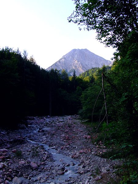 I start my walk shortly before 7 a.m. (thunderstorms are precast for the afternoon) near Untergreuth at an altitude of about 780 m. First the route leads up mainly through forest. First view of the mountain from a river bed..
