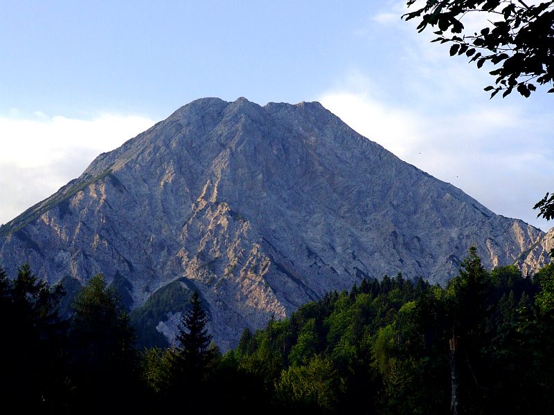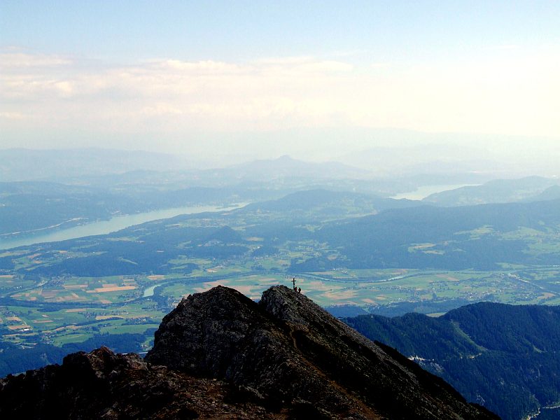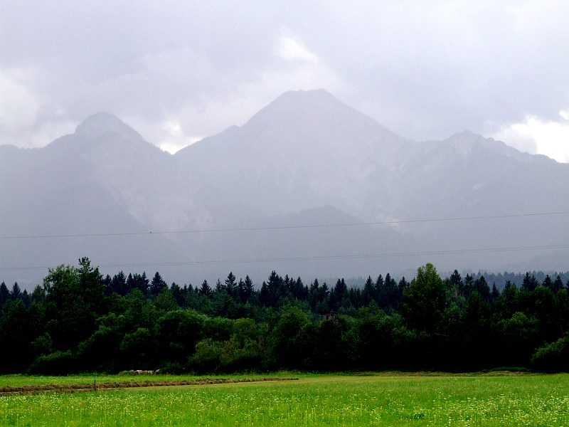 Having entered the car, only after a few kilometres the thunderstorm began with rain. View from near Lake Faak back to Mittagskogel, with Ferlacher Spitze (1.742 m) to its left. My route ledf me up into the hollow between Mittagskogel and Ferlacher Spitze (there is Berta- Huette), then up to the summit of Mittagskogel from the left side, further down the ridge to the right, passing Kleiner Mittagskogel, and descending approximately on the right edge of the picture, walking time about 7 hours.