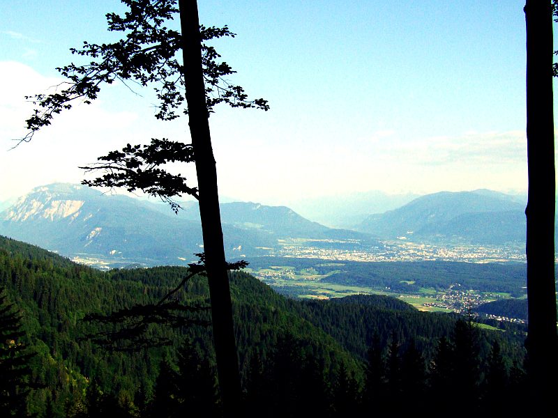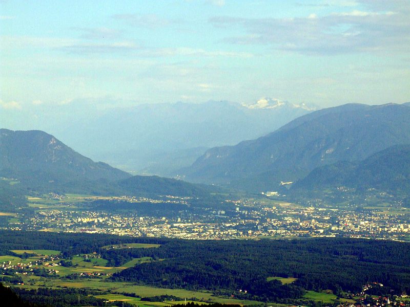 View down from a clearing in northern direction. The city of Villach, Dobratsch to the left. Hohe Tauern on the horizon.