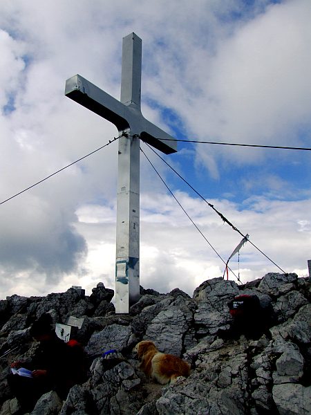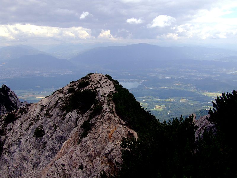 The rocky ridge to "Small" Mittagskogel (1.815 m) is rather exposed in places: Hidden behind the mountain dwarf pines to the right there is one short passage being even worse than the bad step on Blencathra´s sharp edge (Lake district, England), but here there is a fixed steel rope.