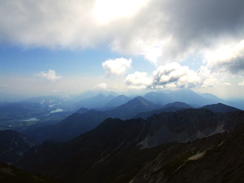 VBiew in eastern direction: The Drau reservoirs to the left and further summits of the Karavanke - group.