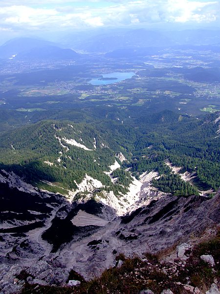 View down the extremely steep rocky escarpents to the north, with Lake Faak.